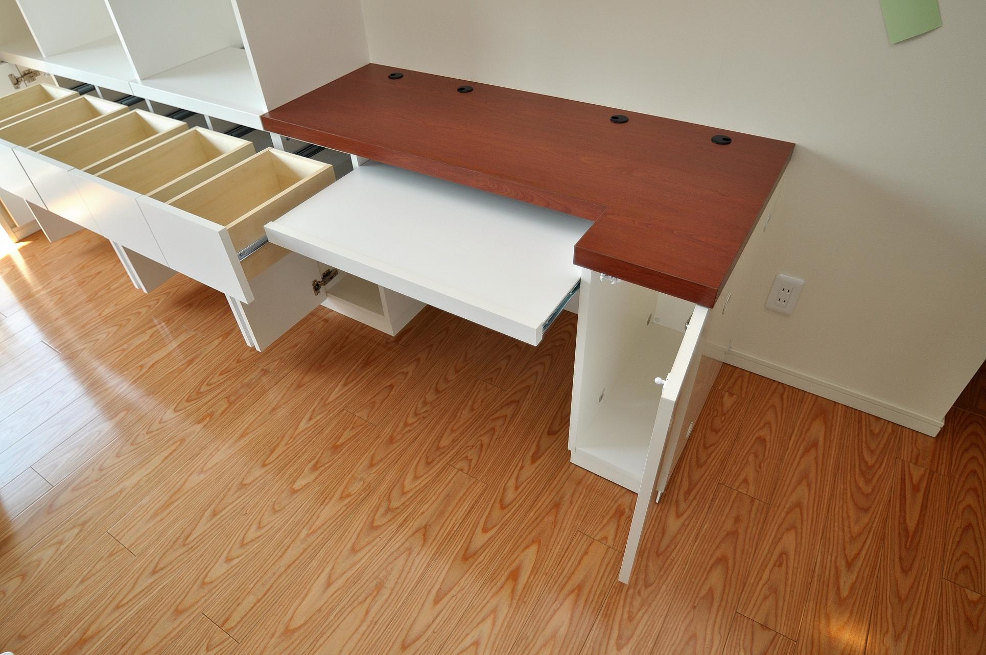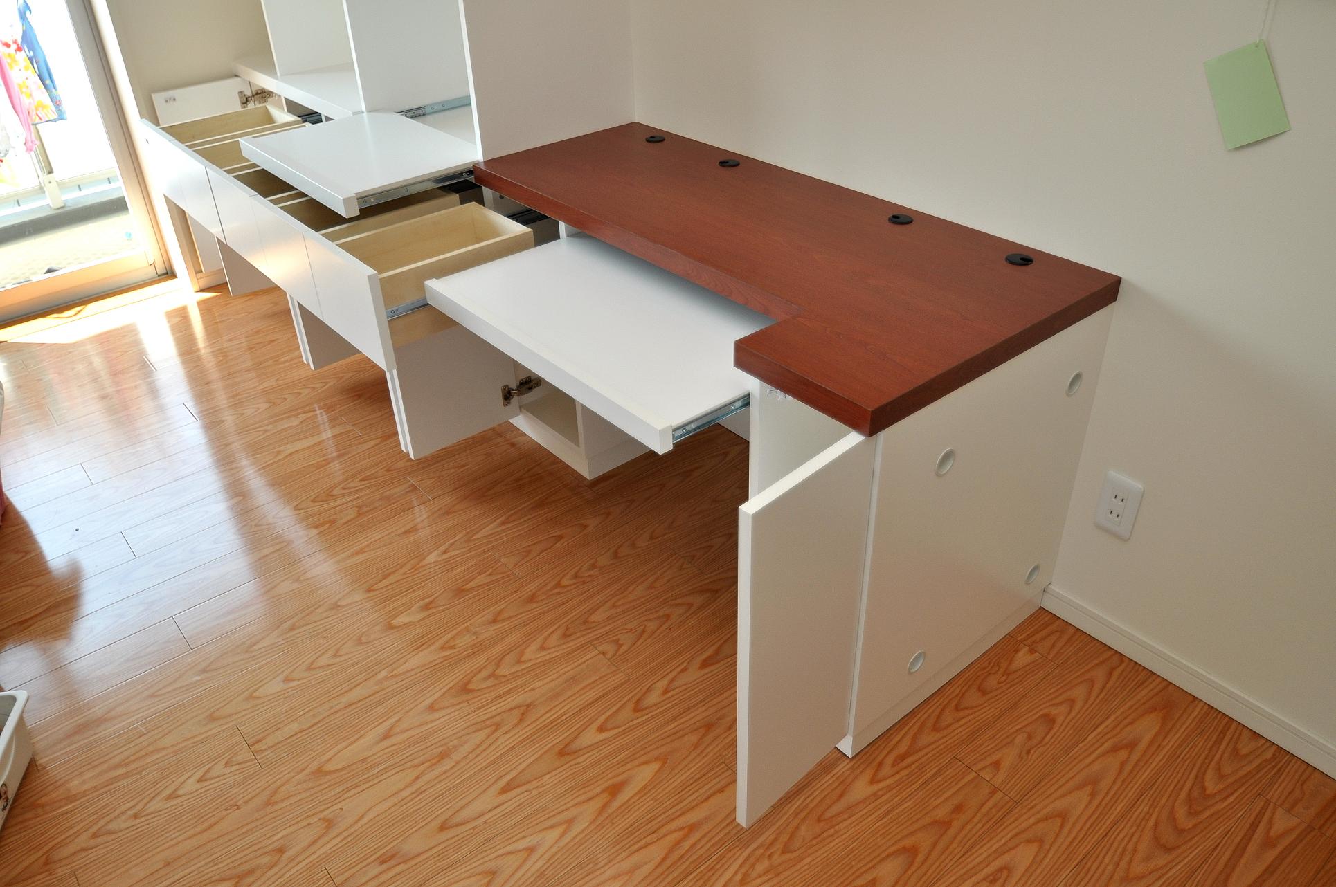 今回のリビングボードの特徴は扁平を掛けたPCデスク。