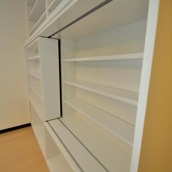 センター部分にスライドボードを噛ませた前後2段のオープン収納。
