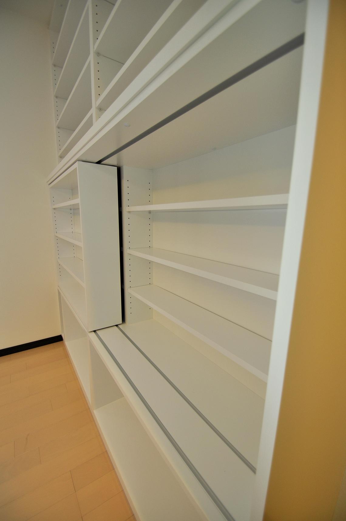 センター部分にスライドボードを噛ませた前後2段のオープン収納。