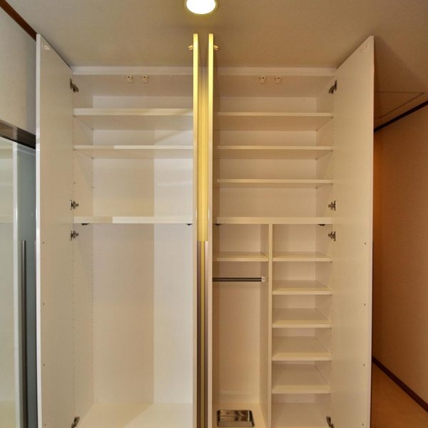 既存で収まっていた下足収納が壁面へ飲み込ませてあるタイプのため、