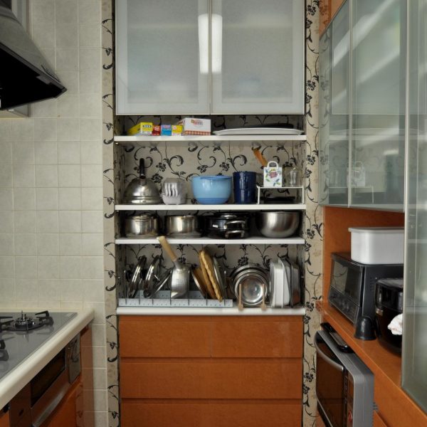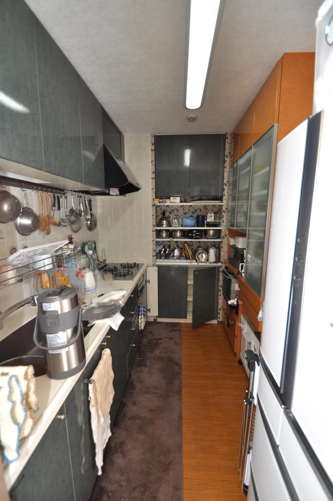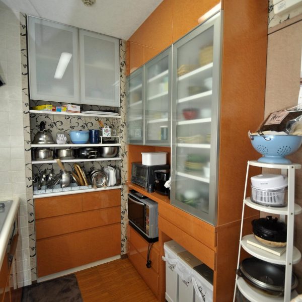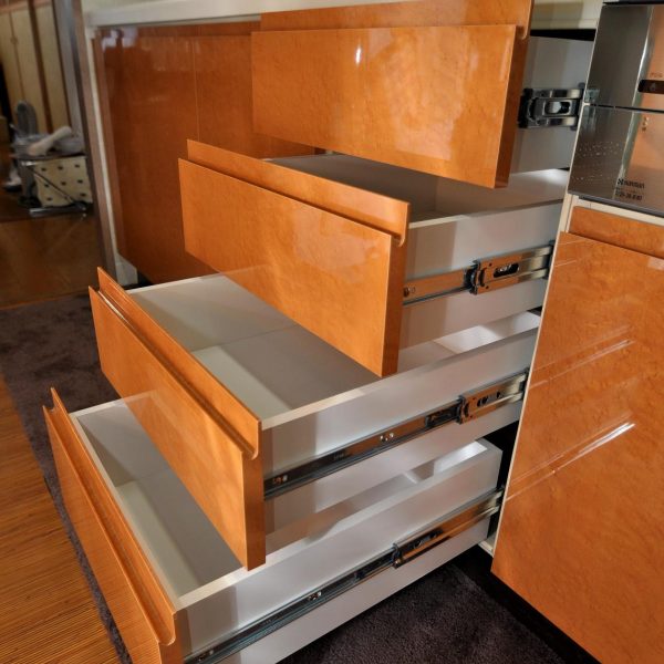 当初開き戸収納だった部分を引き出し式への構造変更(正面壁面収納下場)や、