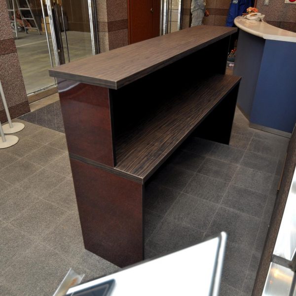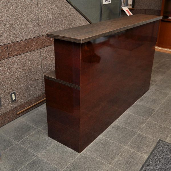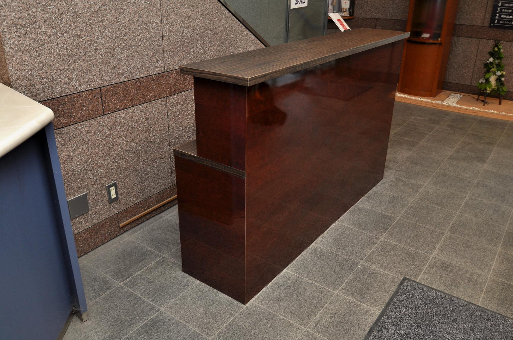 鏡面木目のポリエステル化粧合板と木目調メラミン化粧板幣用の受付カウンターとなります。