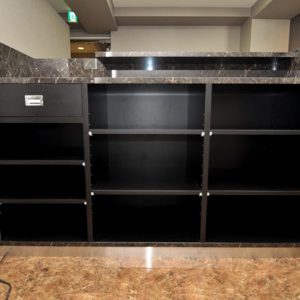 スタッフサイドの収納スペースにはRB-7101黒色化粧板の指定で製作させていただきました。