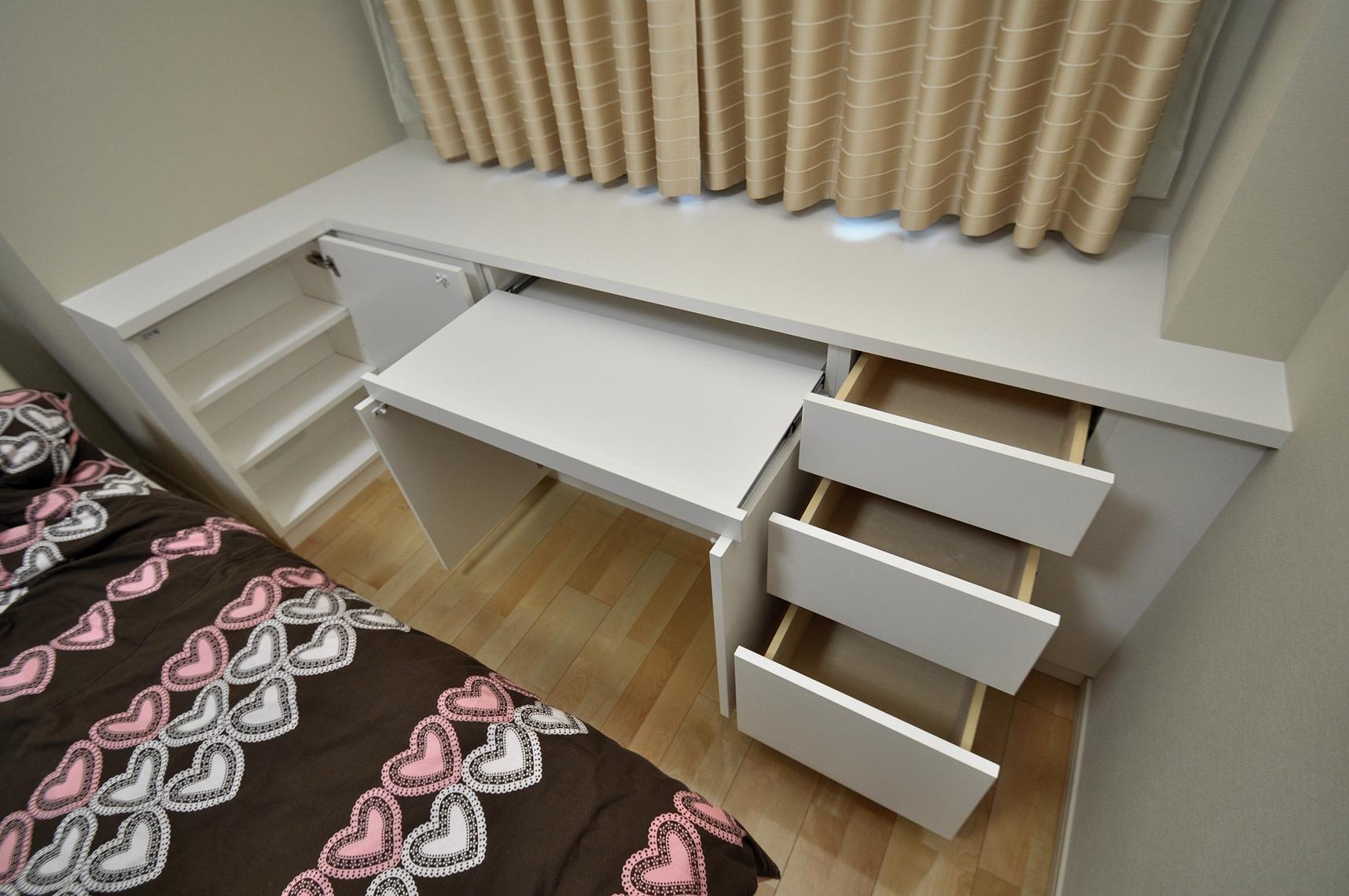 洋室内におけるL型サイドボード・デスク型壁面収納 製作事例。