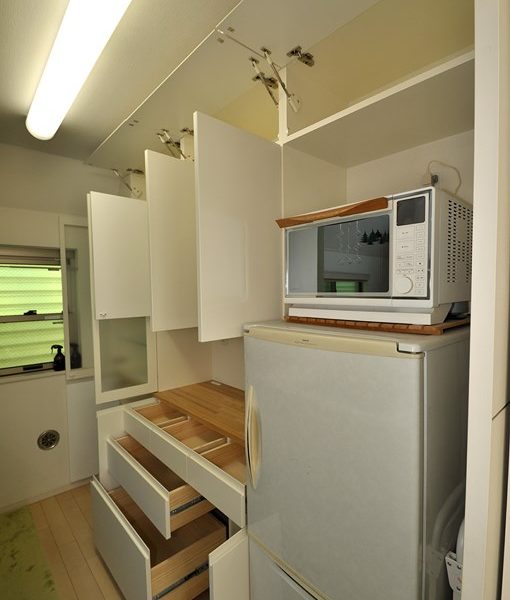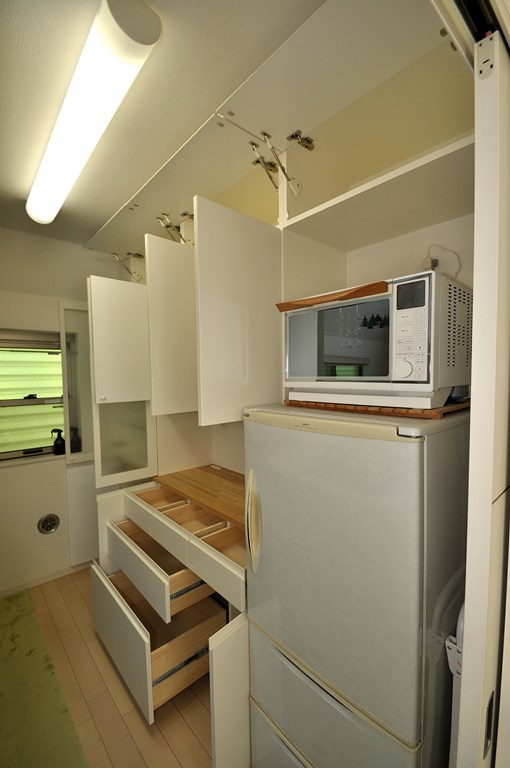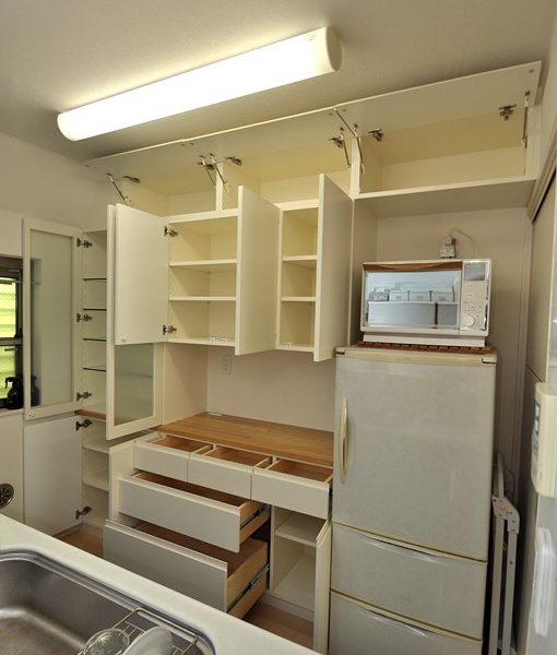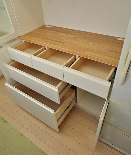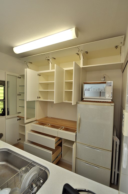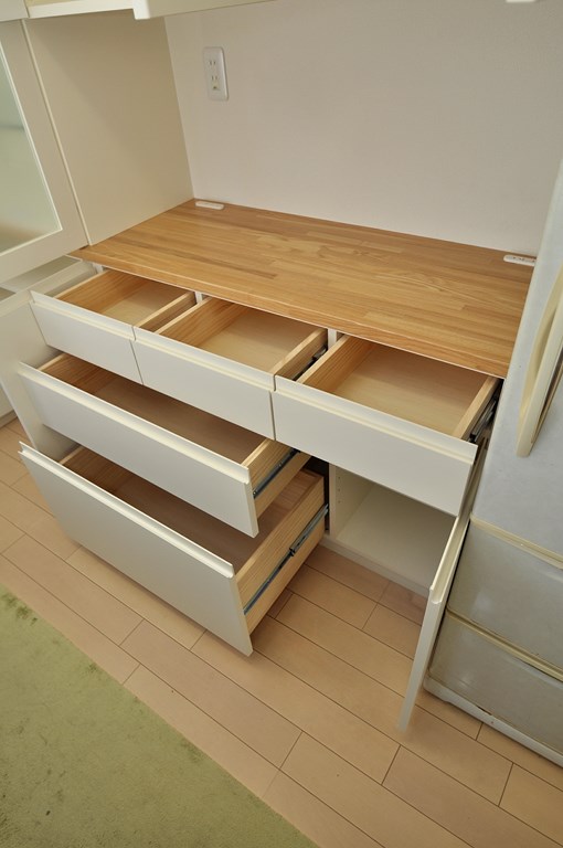既存キッチンのワークトップ正面に対し、使用頻度の高い引き出し収納をまとめてあります。
