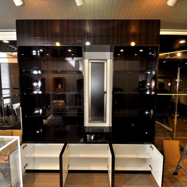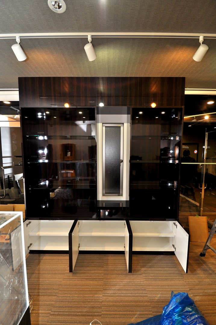 基本の割付は天板下の観音収納が3杯、建築窓を挟んでオープンタイプの飾り棚が2本。