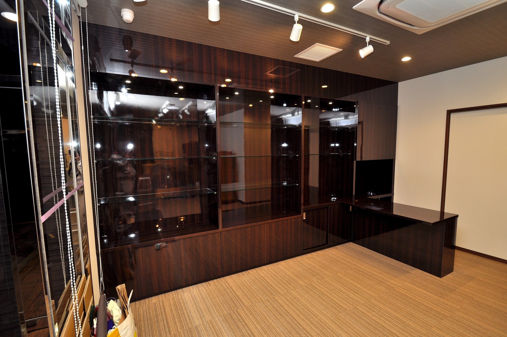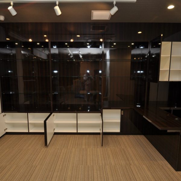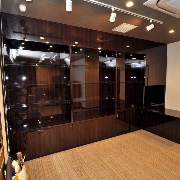 飾り棚部分には8/mm厚の強化硝子を陳列棚に採用し、照明には電球色のLEDダウンライトを選択。