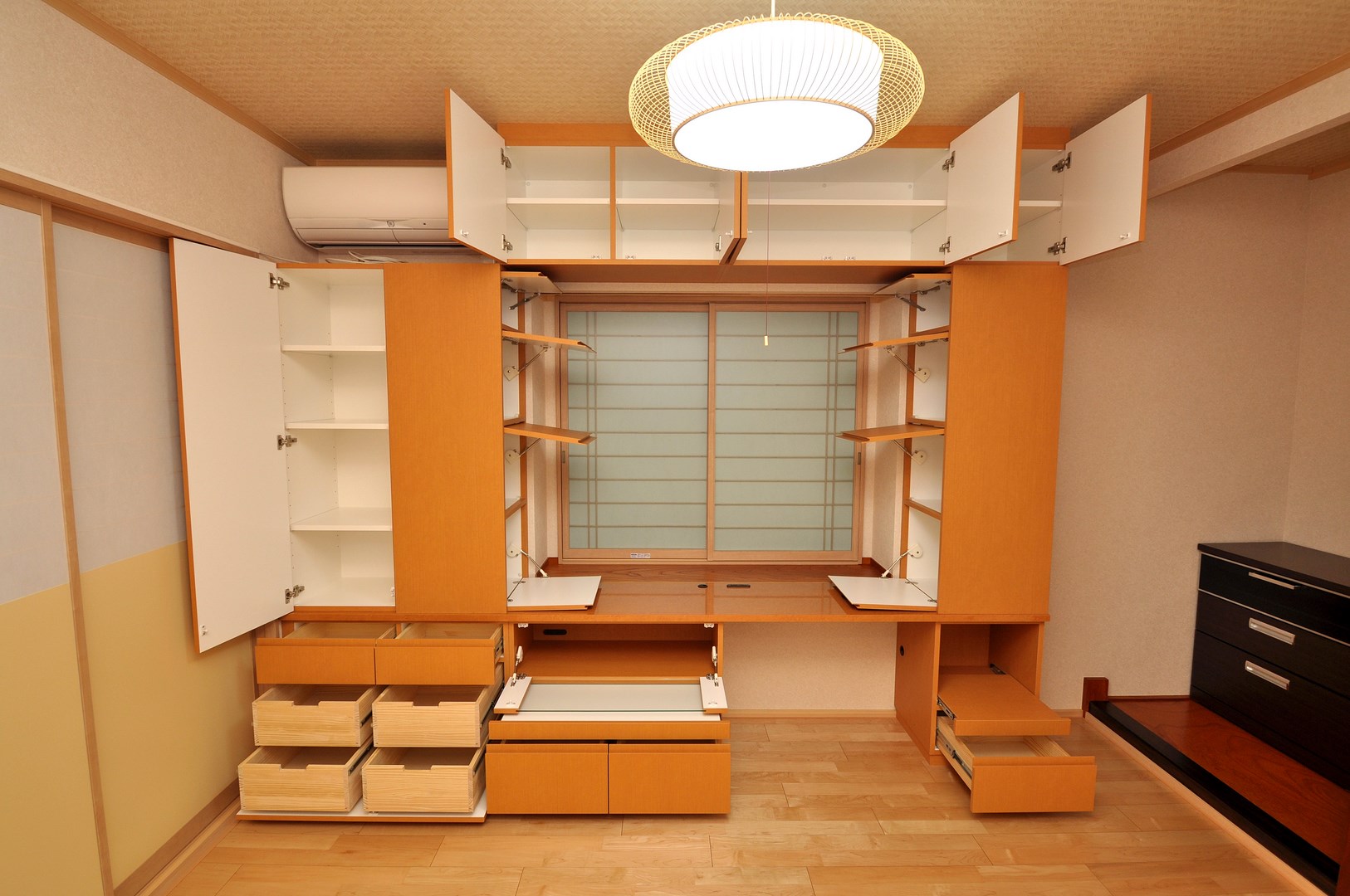 甲板(天板下)左側から抽斗が2杯、プッシュダウン扉内部に抽斗が4杯。