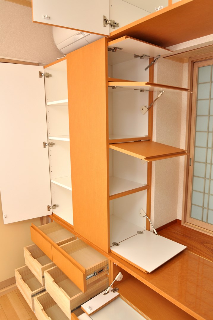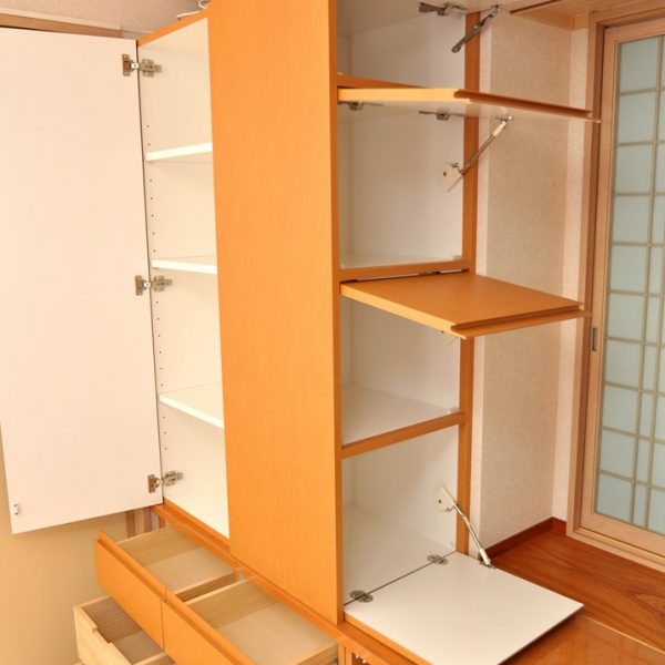 中段左側には開き戸収納と間口方向を変えたスイングアップ扉収納が3箇所。