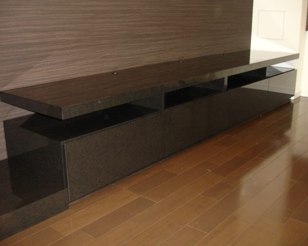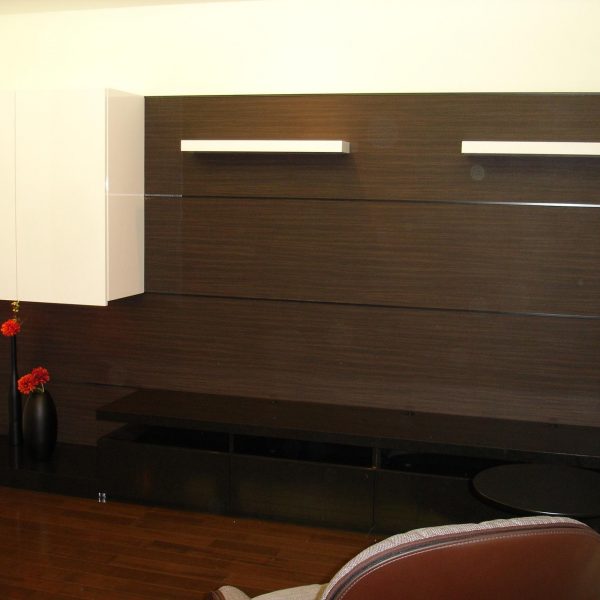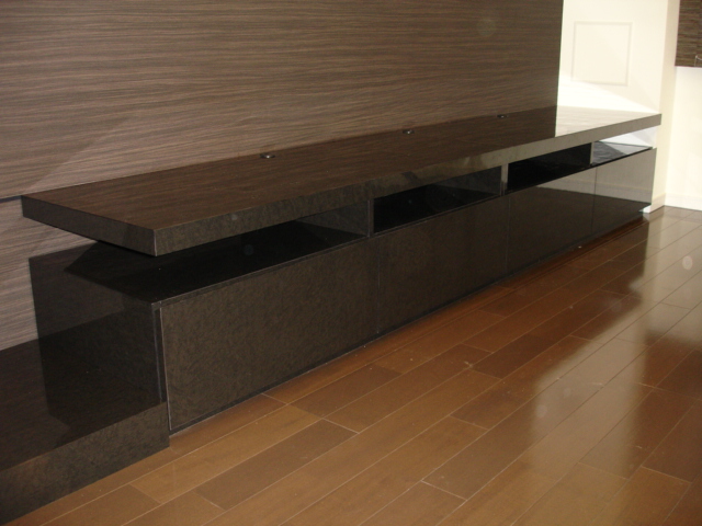 右下のテレビボードは両翼状に背板を抜き、天板の強度のみで持たせる意匠重視の設計。