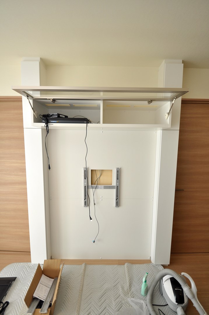 TVブラケットの吊り込み下地製作に際し、配線経路全てを化粧パネル裏に設定。