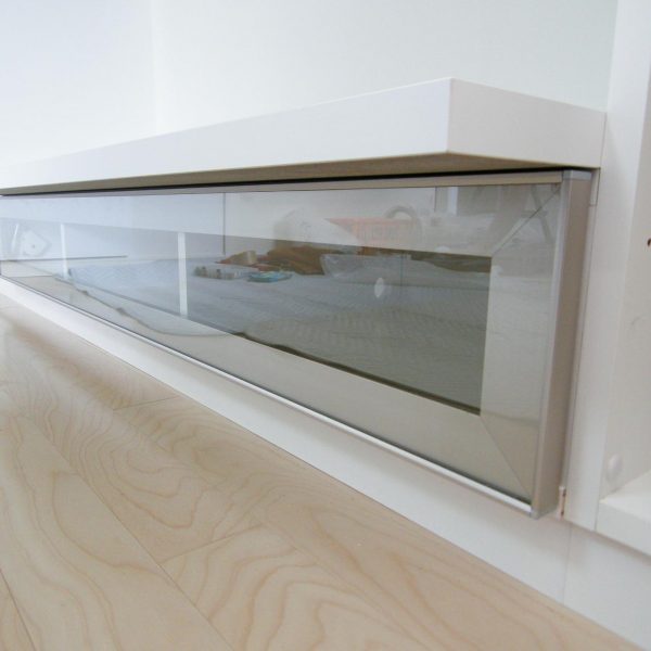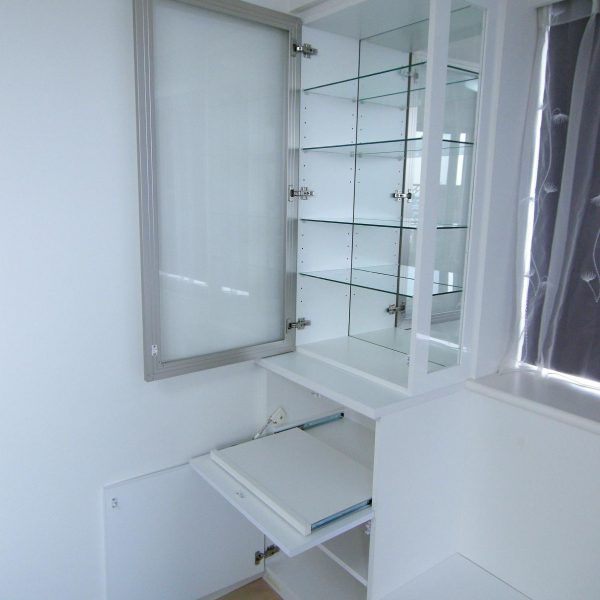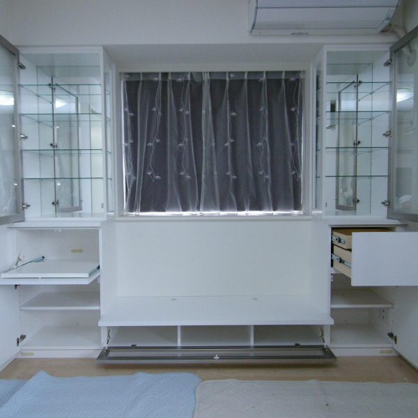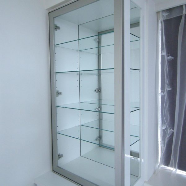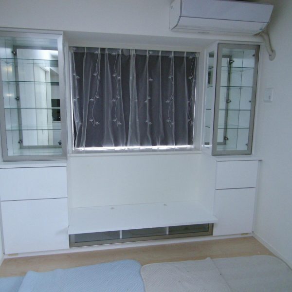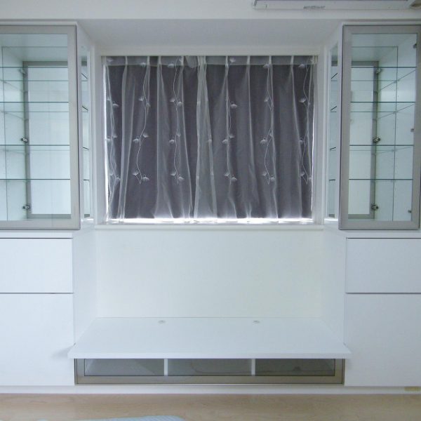 両袖には飾り棚(キュリオケース)状に製作することで、収納内部への採光を確保。