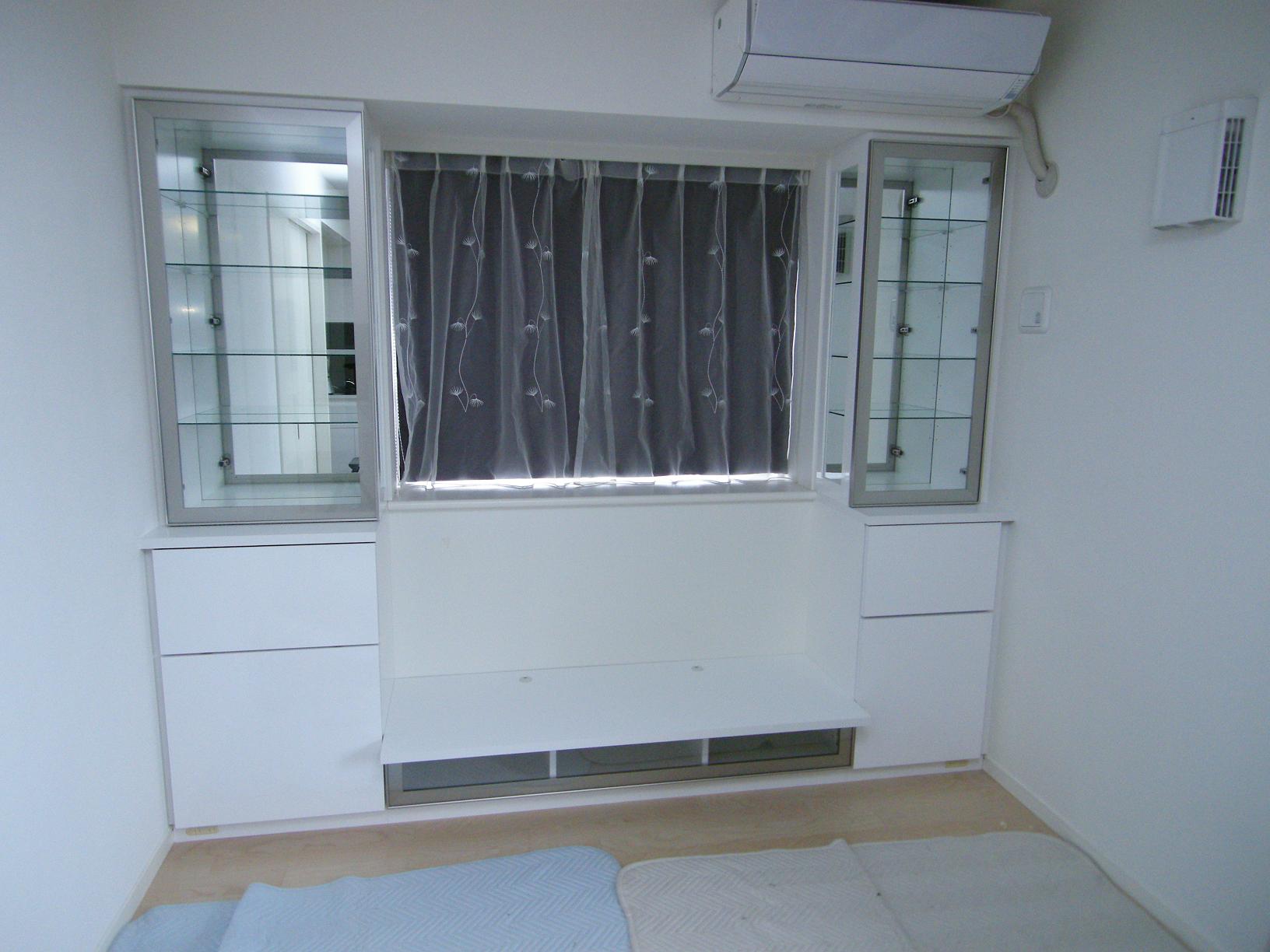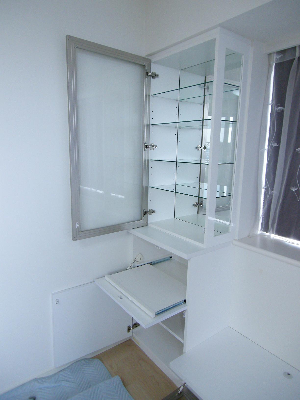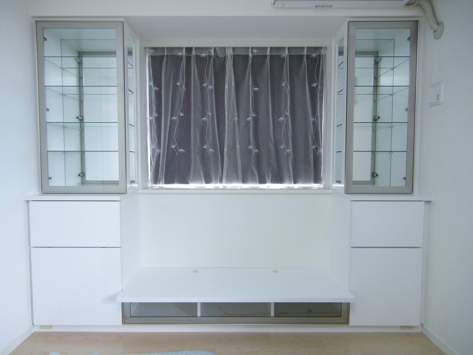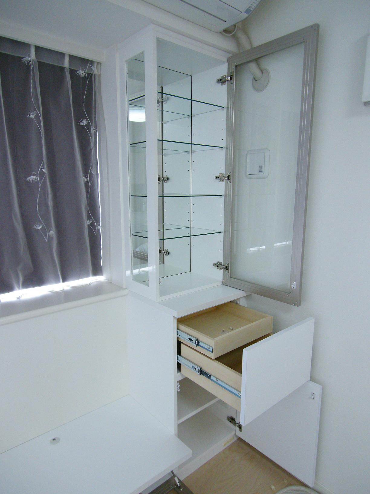 両袖には飾り棚(キュリオケース)状に製作することで、収納内部への採光を確保。