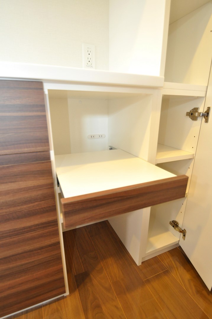 下台部分には抽斗・開き戸収納・芯出し(スライド天板)スペースを。