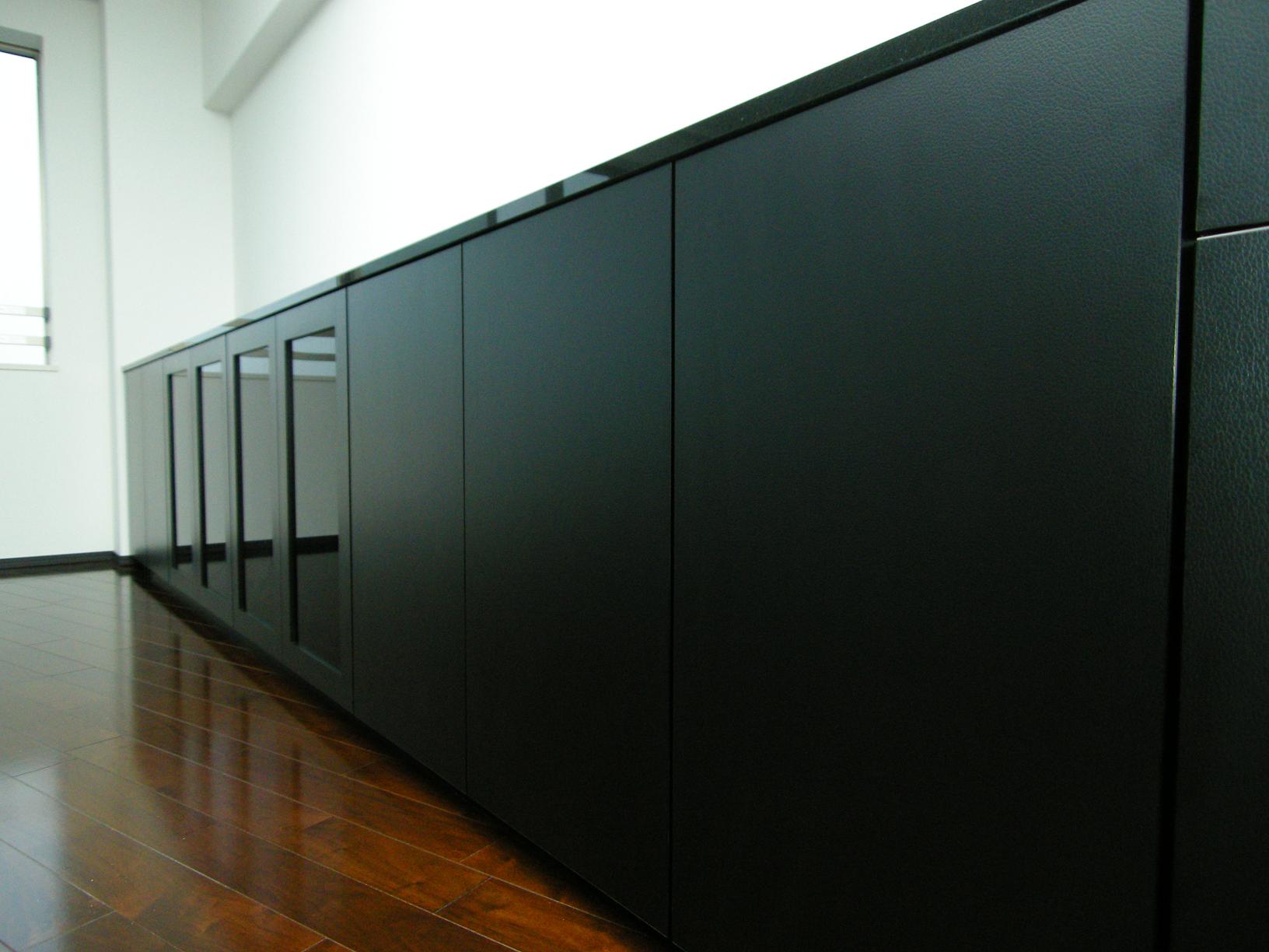 外装面材は黒革調のメラミン化粧板とポリエステル化粧合板を採用。