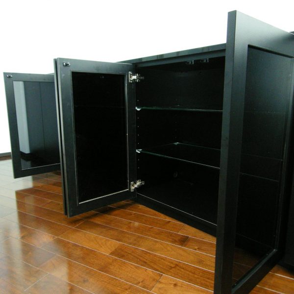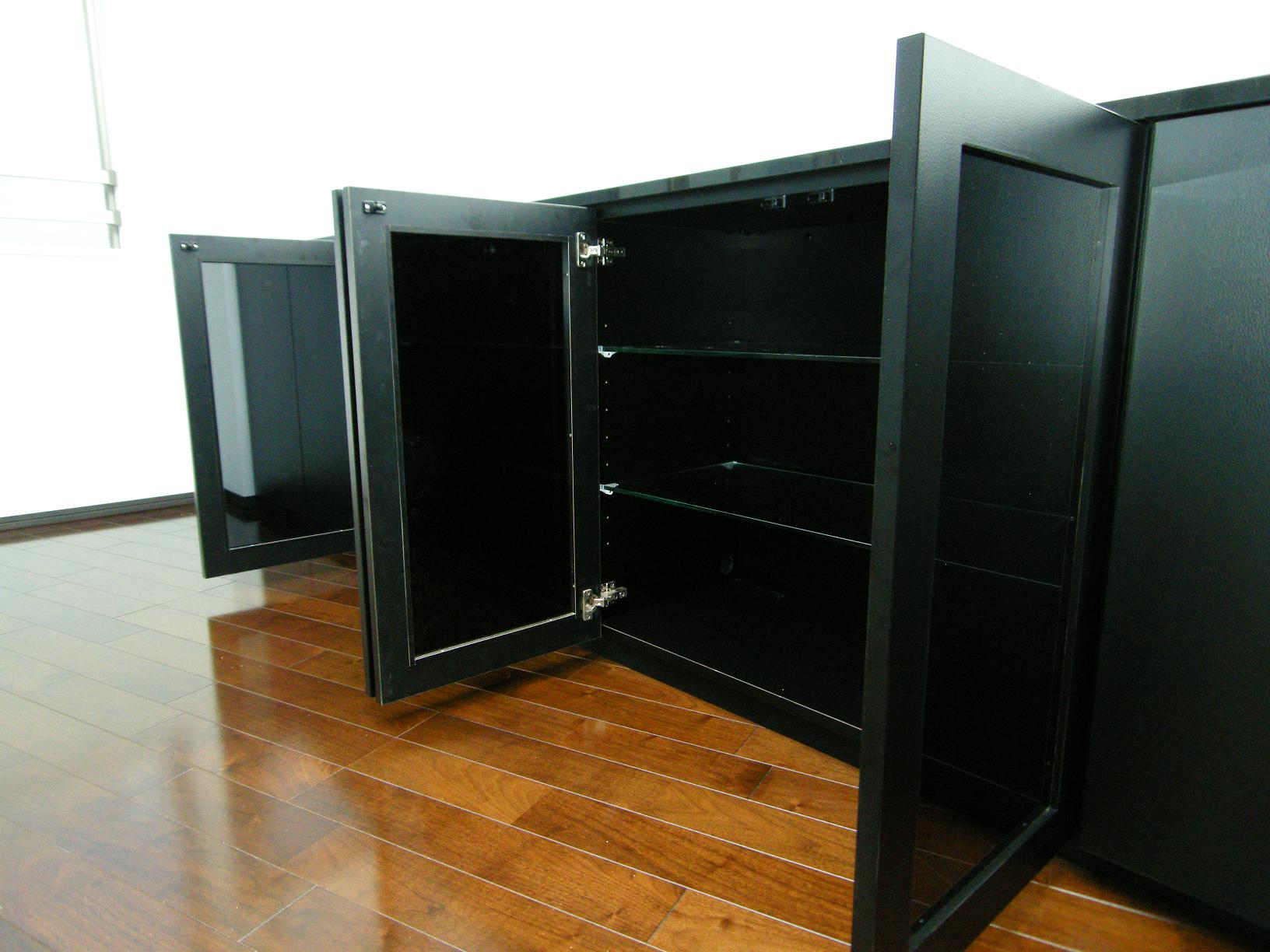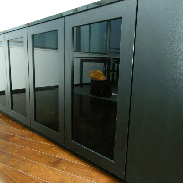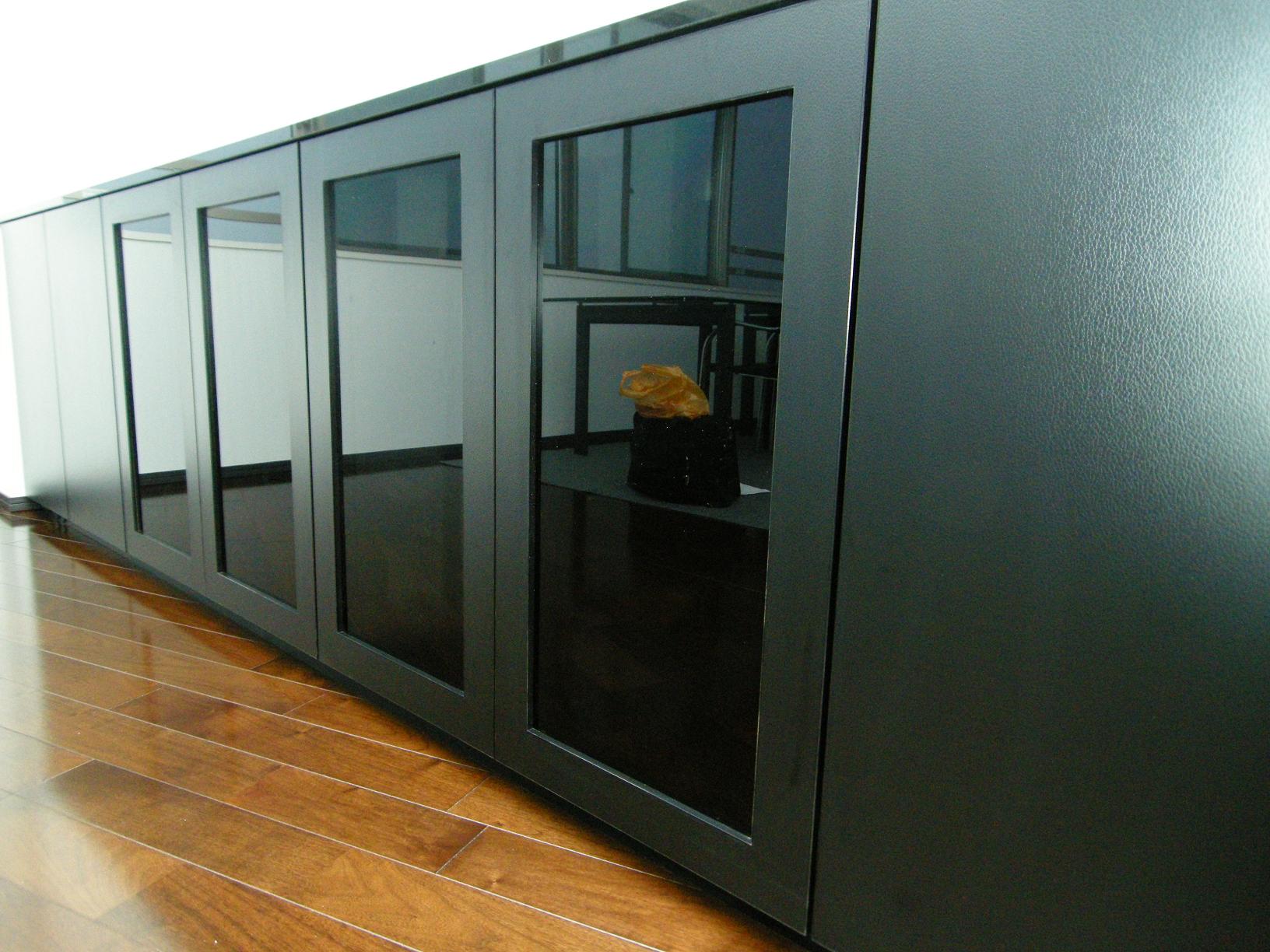 テレビボード部分の硝子扉には、レザー調のメラミン材とスモーク硝子を四方枠扉に。