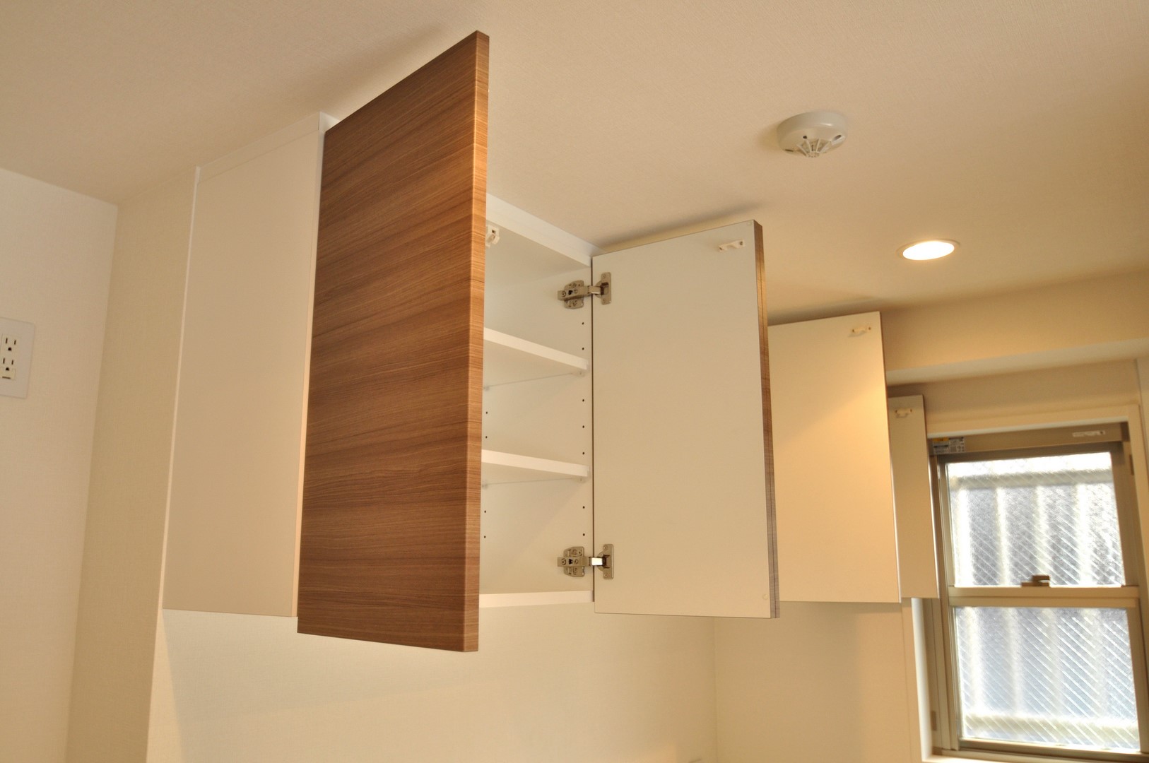 吊戸棚部分は観音収納×2杯と開き戸収納が1杯。