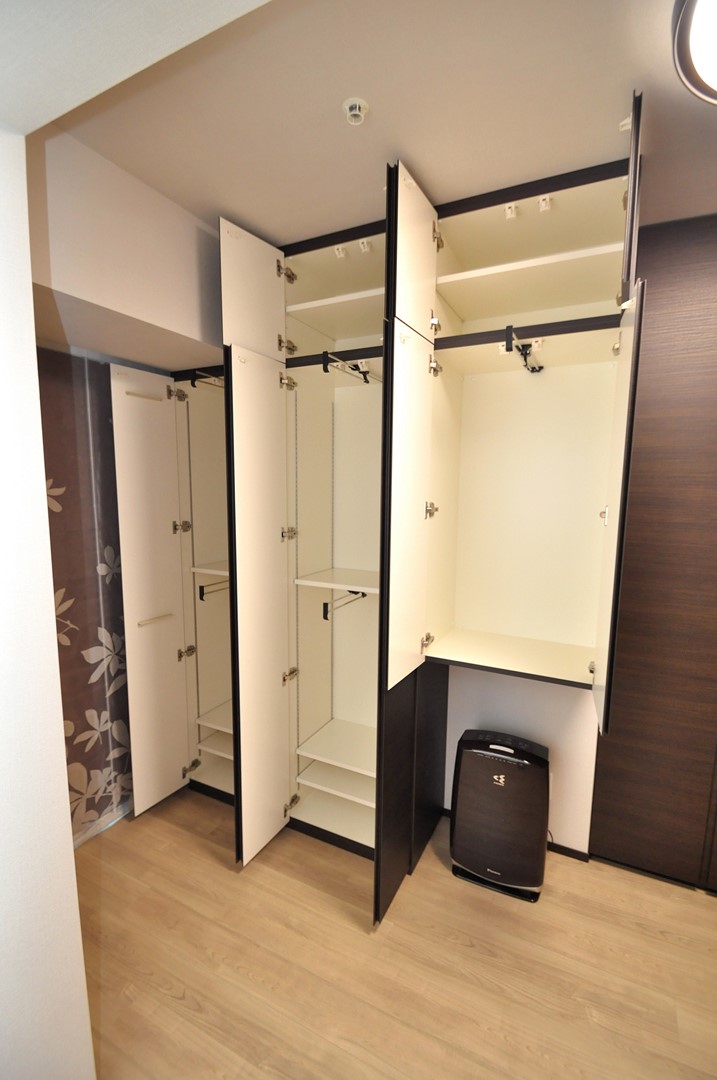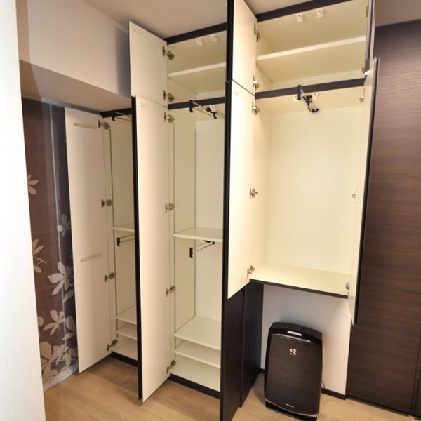 ネクタイハンガーやベルトハンガーは扉裏に設定し、服飾小物類の収納も考慮。
