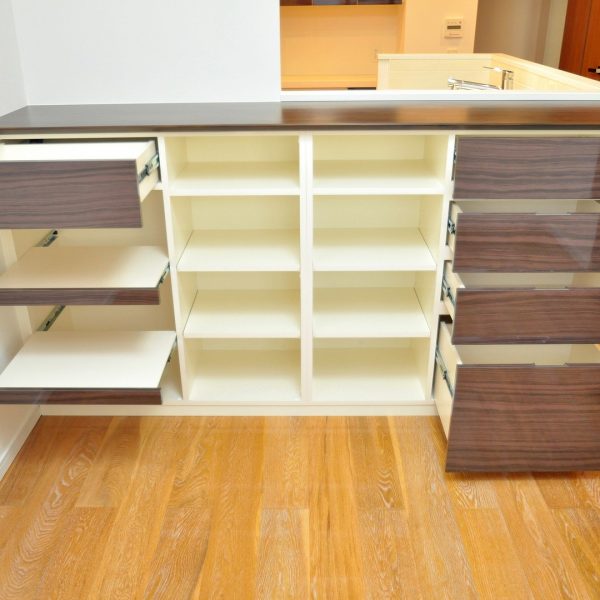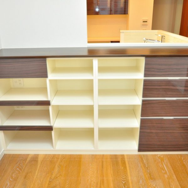 収納部分は費用対効果を優先した白色ポリエステル化粧合板を採用致しております。