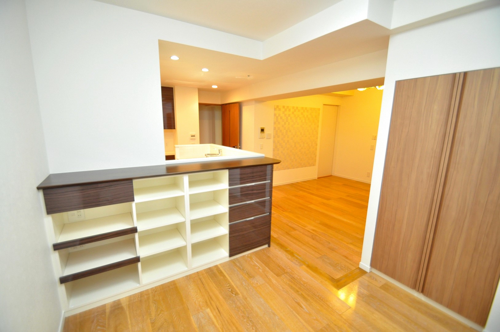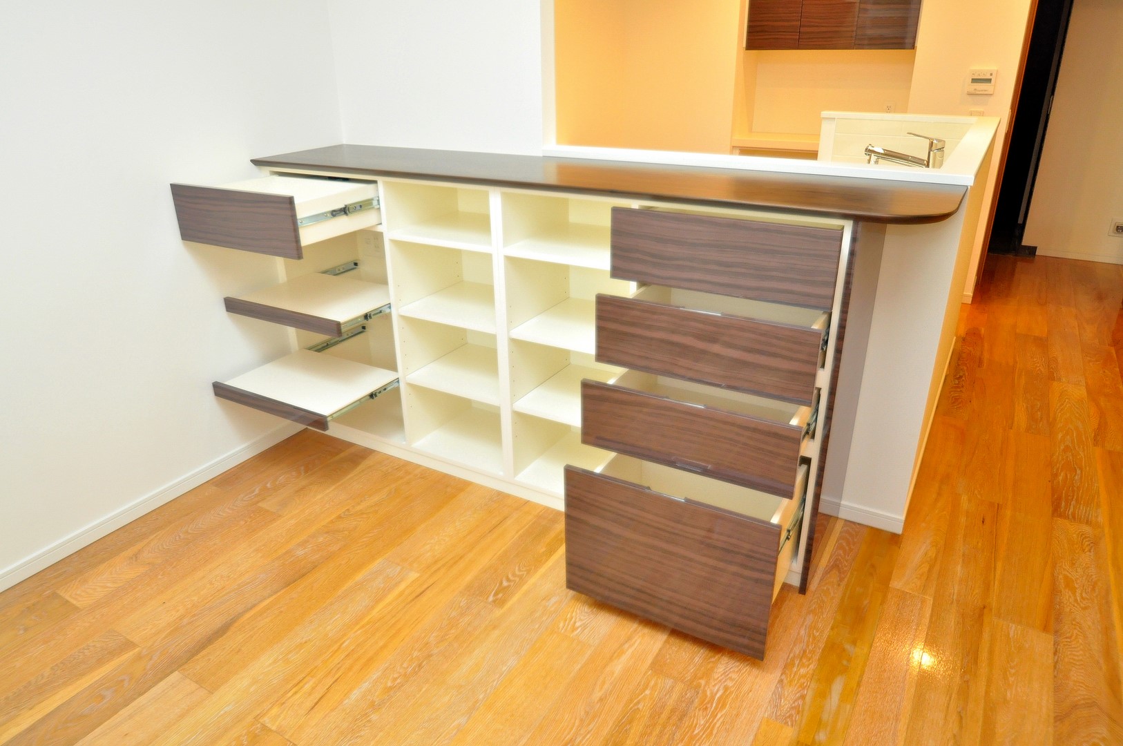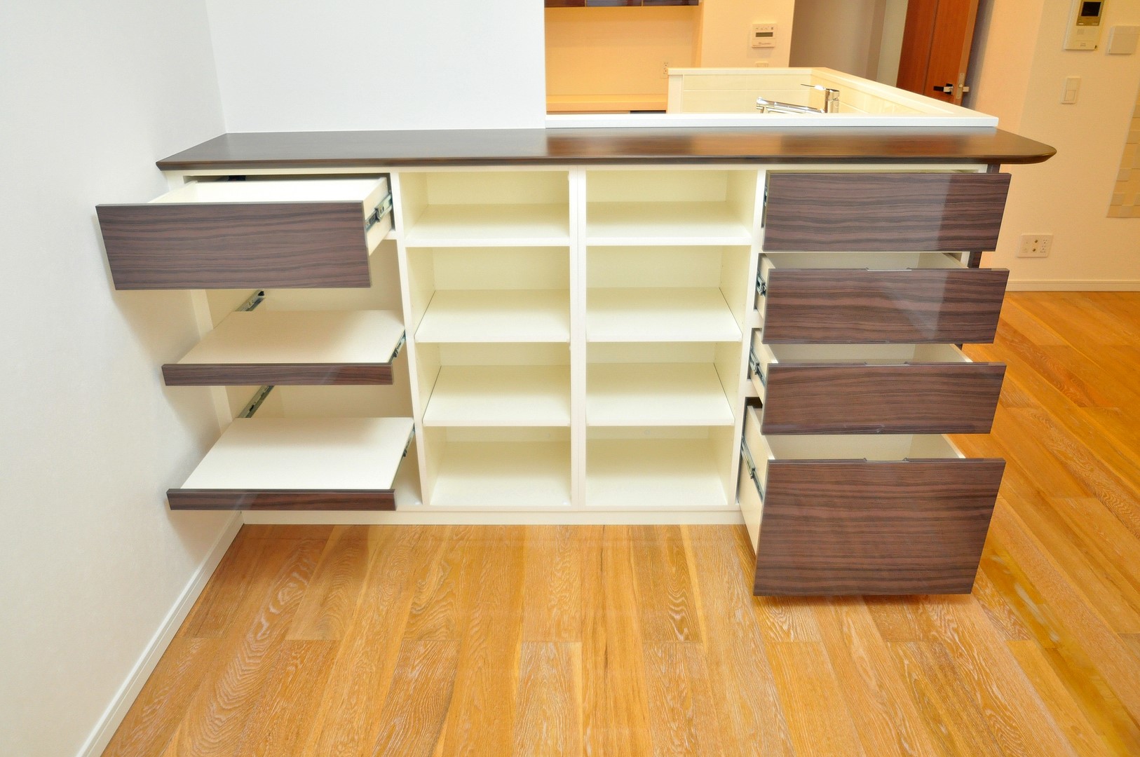 扉・前板には鏡面木目のメラミン化粧板、