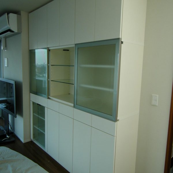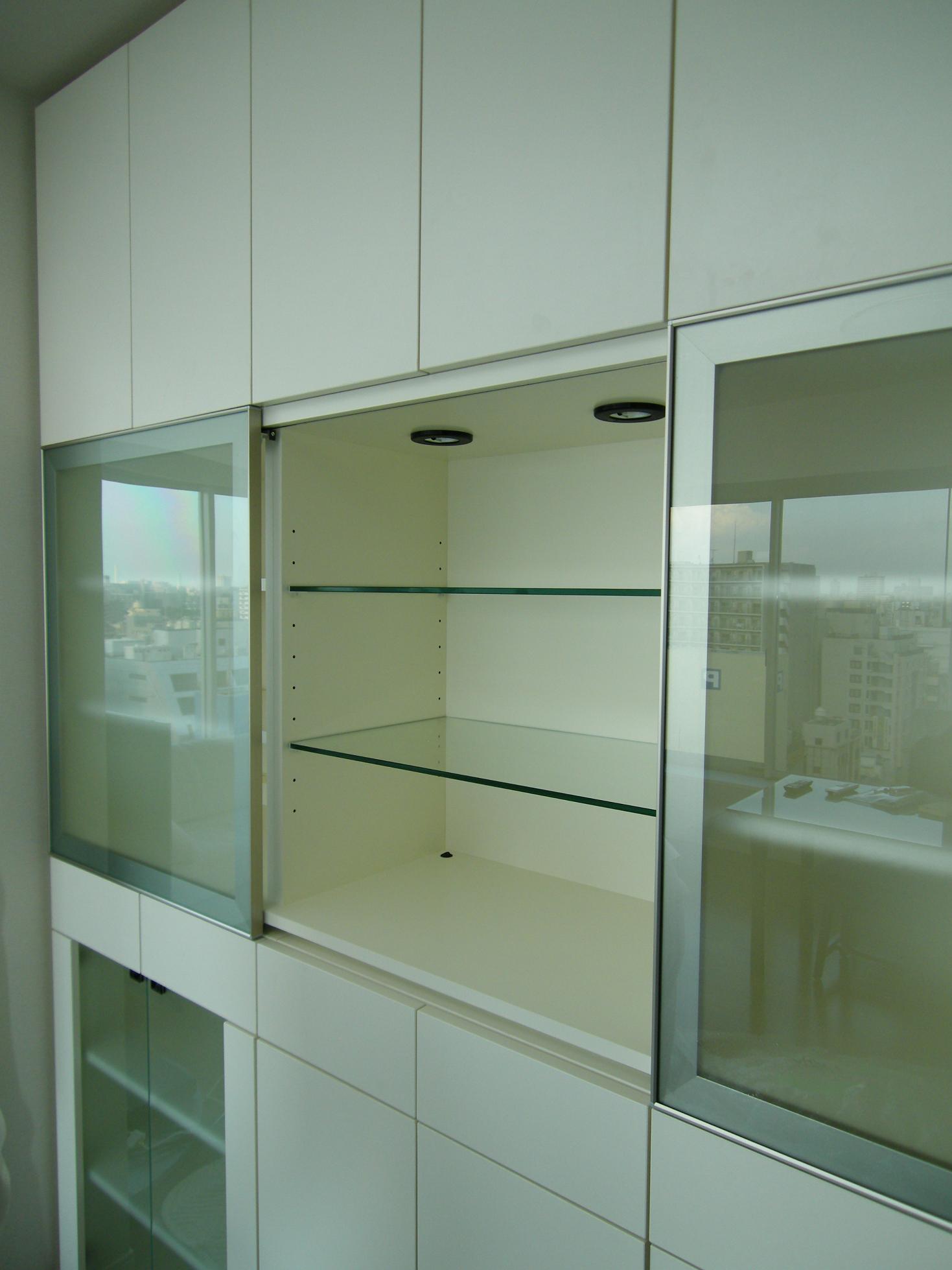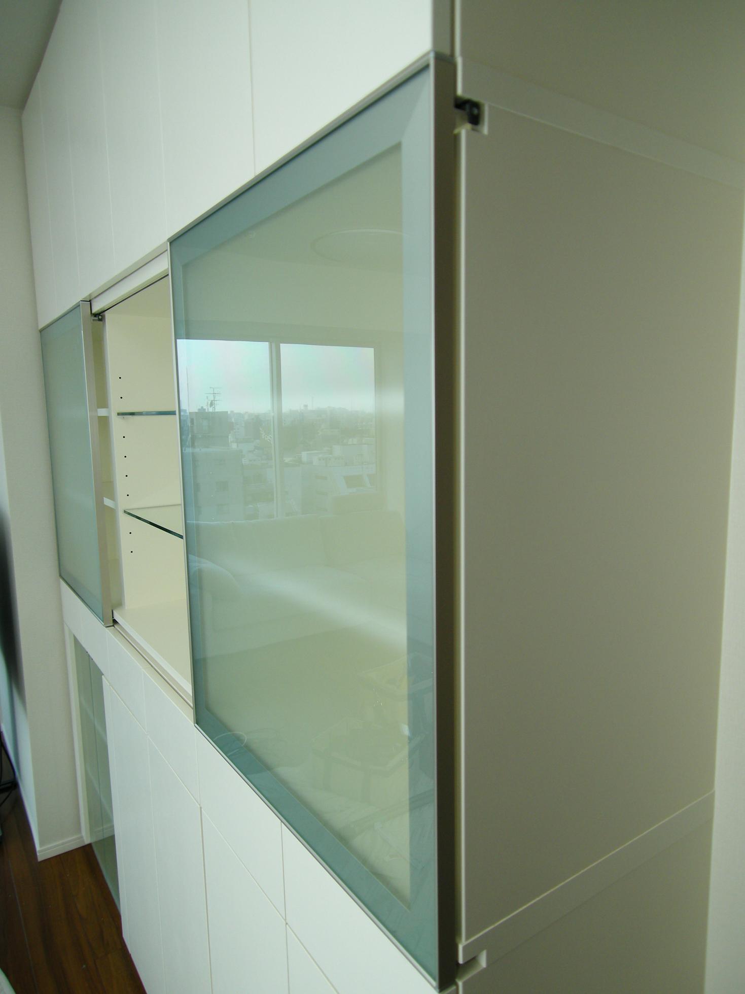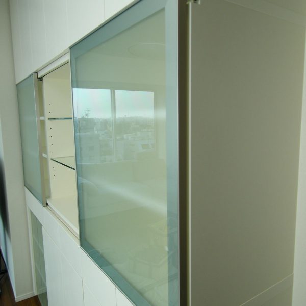 リモコンの赤外線を考慮したフロスト硝子の片袖扉を採用致しました。