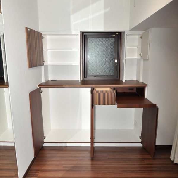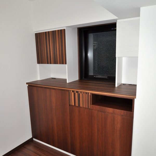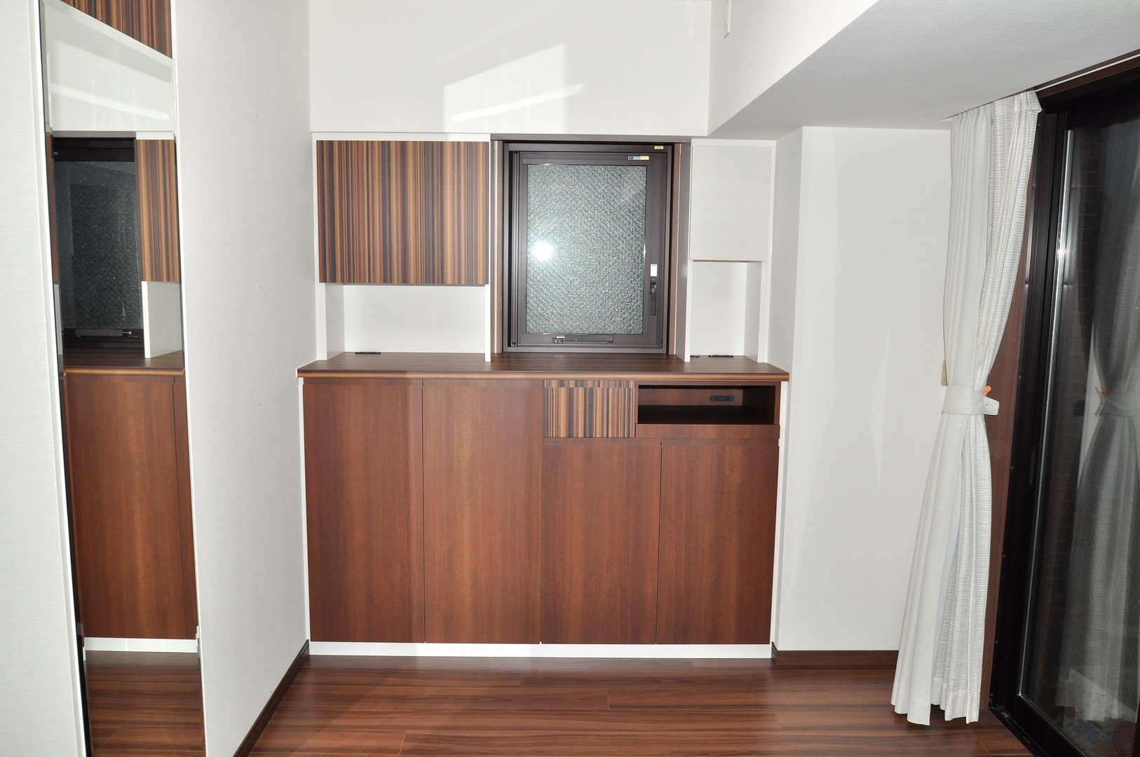 今回まとめてオーダーをいただいた寝室の吊戸棚(画像左)が写り込んでおります。