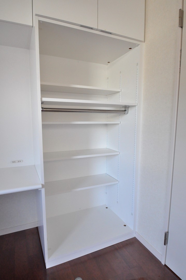 深く奥行きを取った右側のトール収納は、可動棚板を細かく分割することで、