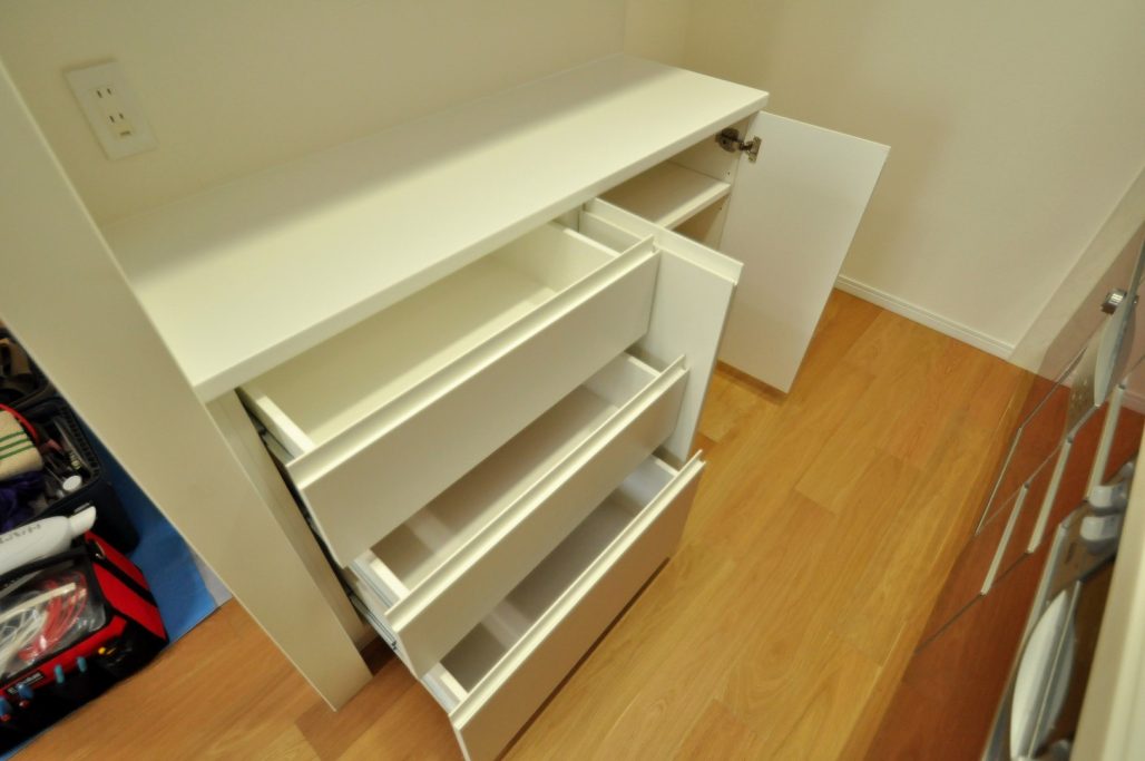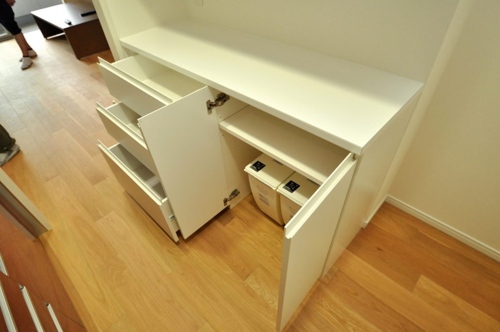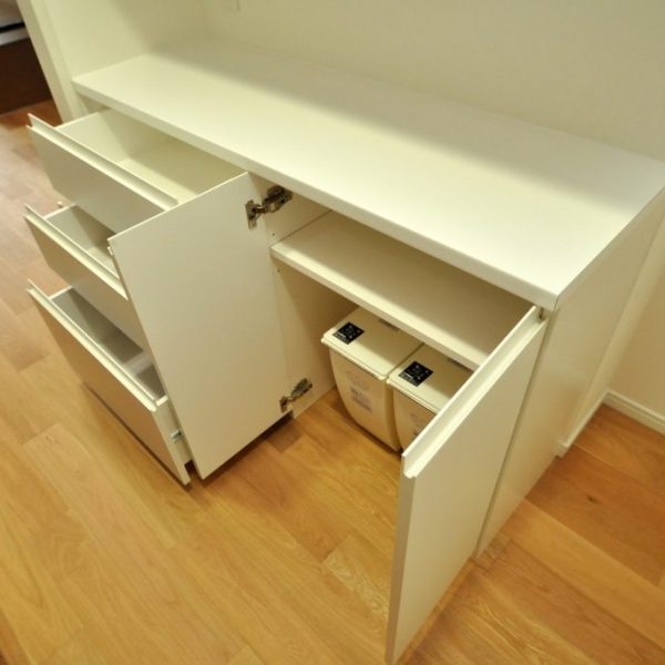 カウンターキャビネットの割り付けは、抽斗×3セットと開き戸タイプのダストボックス収納。