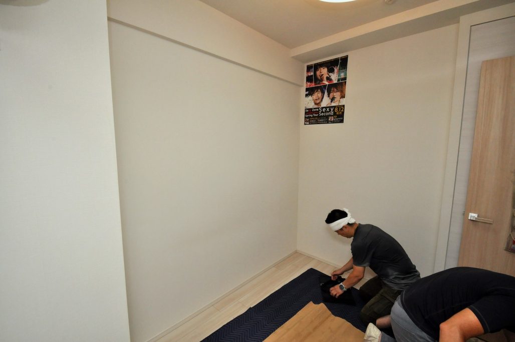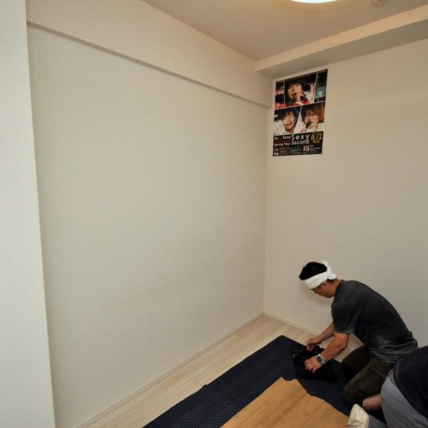 吊式の壁面収納はしっかりと壁面下地と天井下地にビス固定。