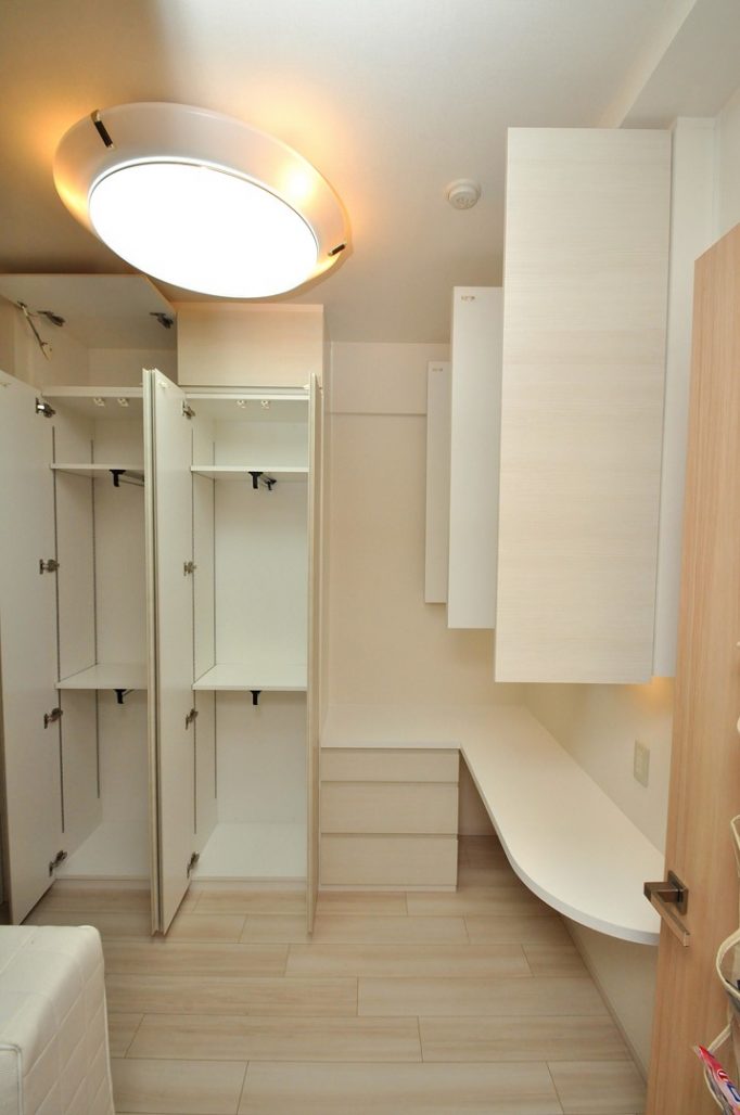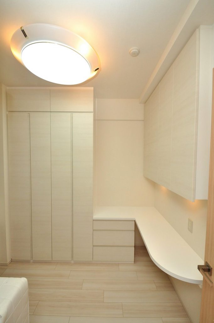 しっかりとしたサイズのワードローブに加え、チェスト部分を袖机としたL字型に回るワークスペースが印象的です。