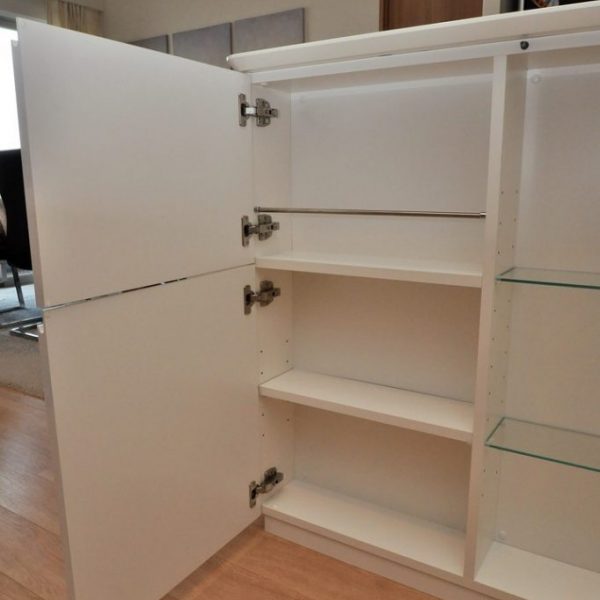 分割した面材扉の上部はブックシェルフとしてお使いいただく事から、倒れ止めに9/mmのステンレス製パイプを設定いたしました。