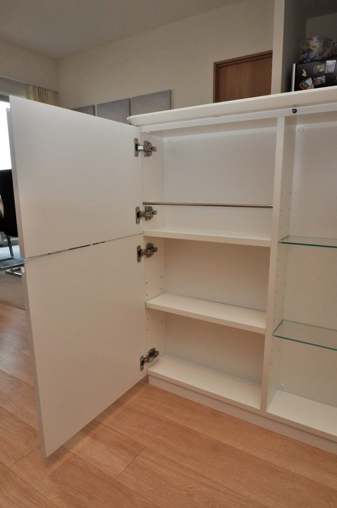 分割した面材扉の上部はブックシェルフとしてお使いいただく事から、倒れ止めに9/mmのステンレス製パイプを設定いたしました。