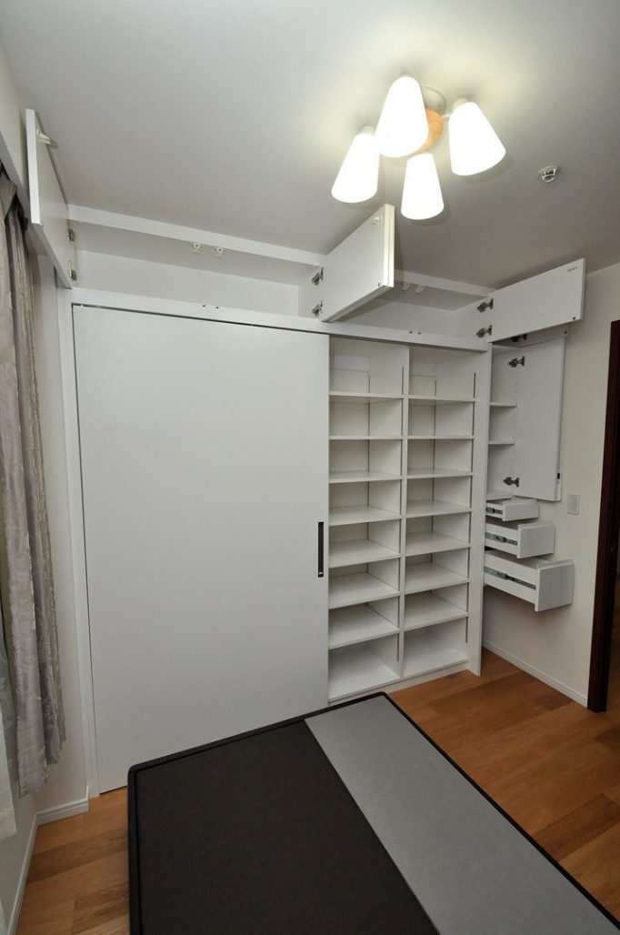 割付は引戸式の可動棚収納、開き戸収納と抽斗で構成。