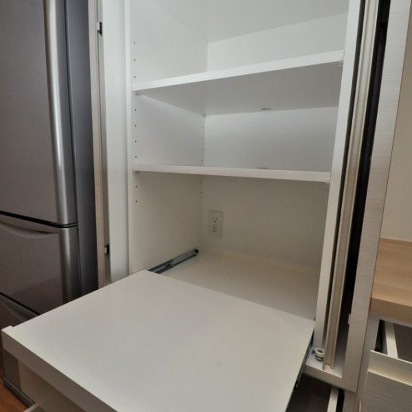 こちらのカップボードの特徴は、中央に設けたフリッパー扉式の機器収納ではないでしょうか。