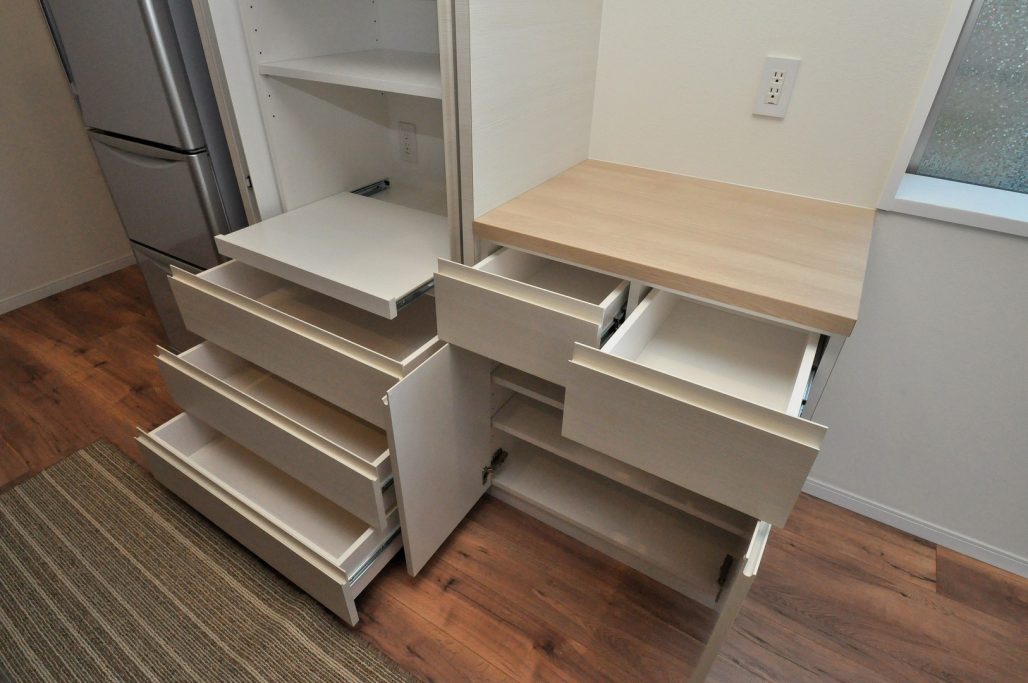 こちらのカップボードの特徴は、中央に設けたフリッパー扉式の機器収納ではないでしょうか。