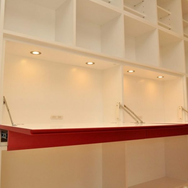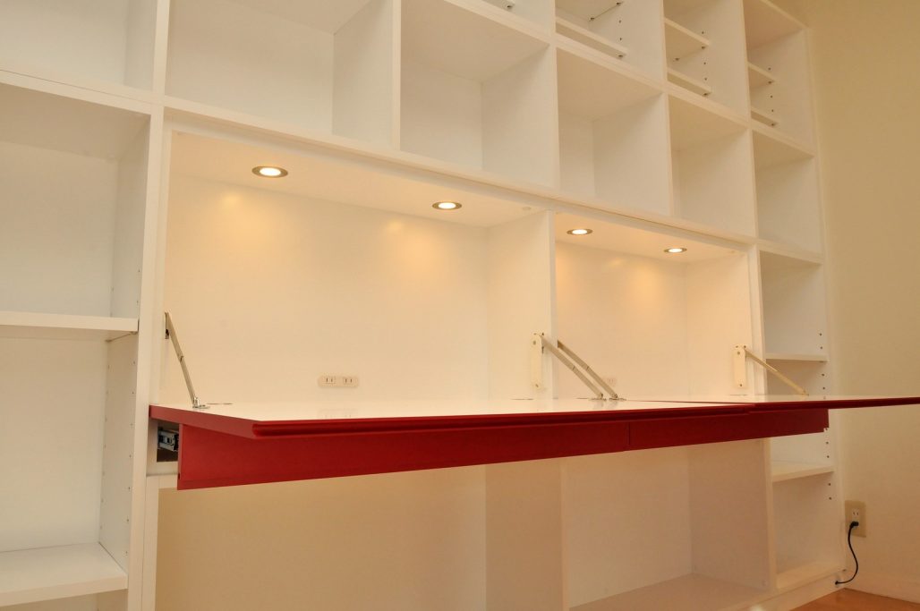 差し色のプルダウン扉は、ライティングデスクの天板として。