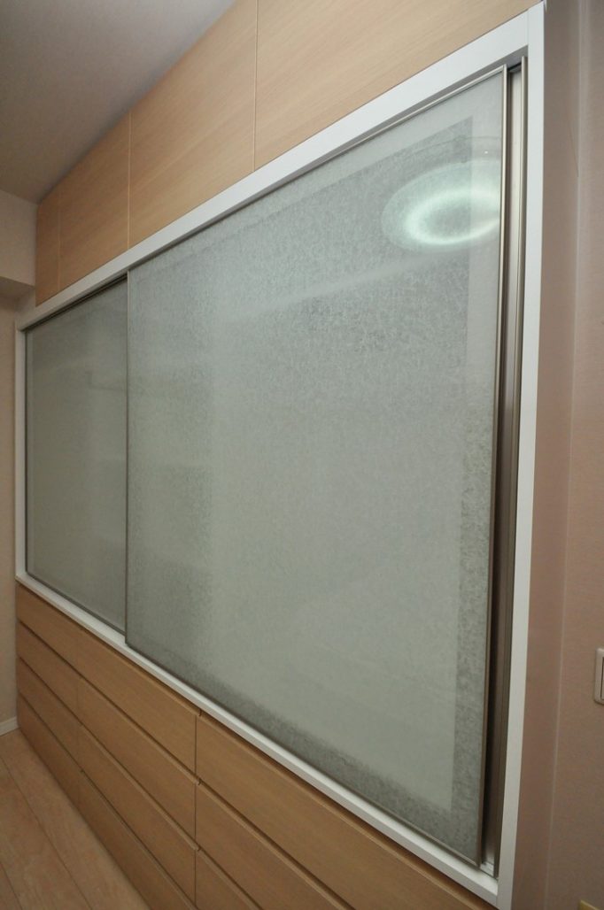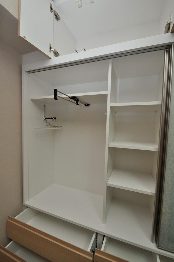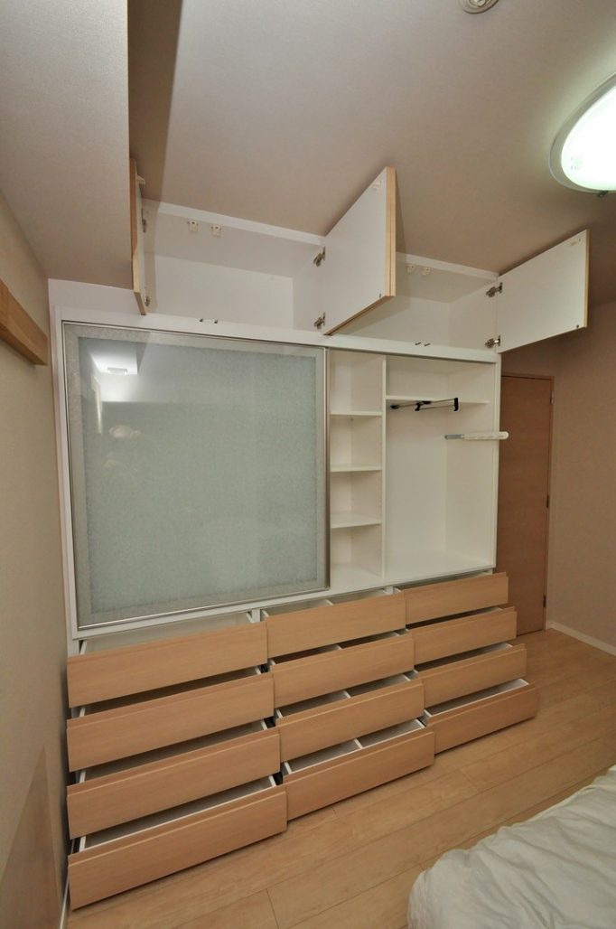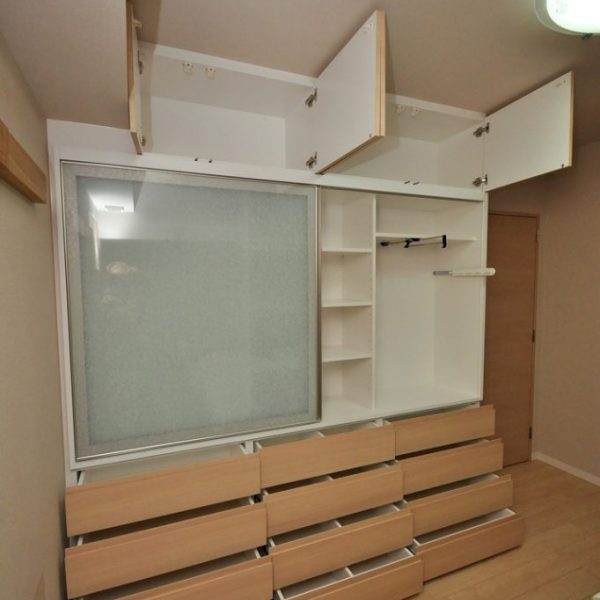 割付構成は上から開き戸(天袋)、アルミフレーム扉が印象的な引戸収納、すべて抽斗を採用した下部キャビネット。
