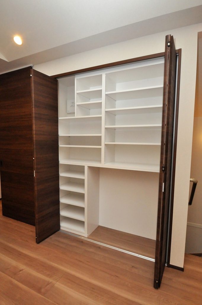 大きな空間を使いやすく間仕切る事で、壁面収納をビルトインしたような使い勝手にカスタムを致しました。