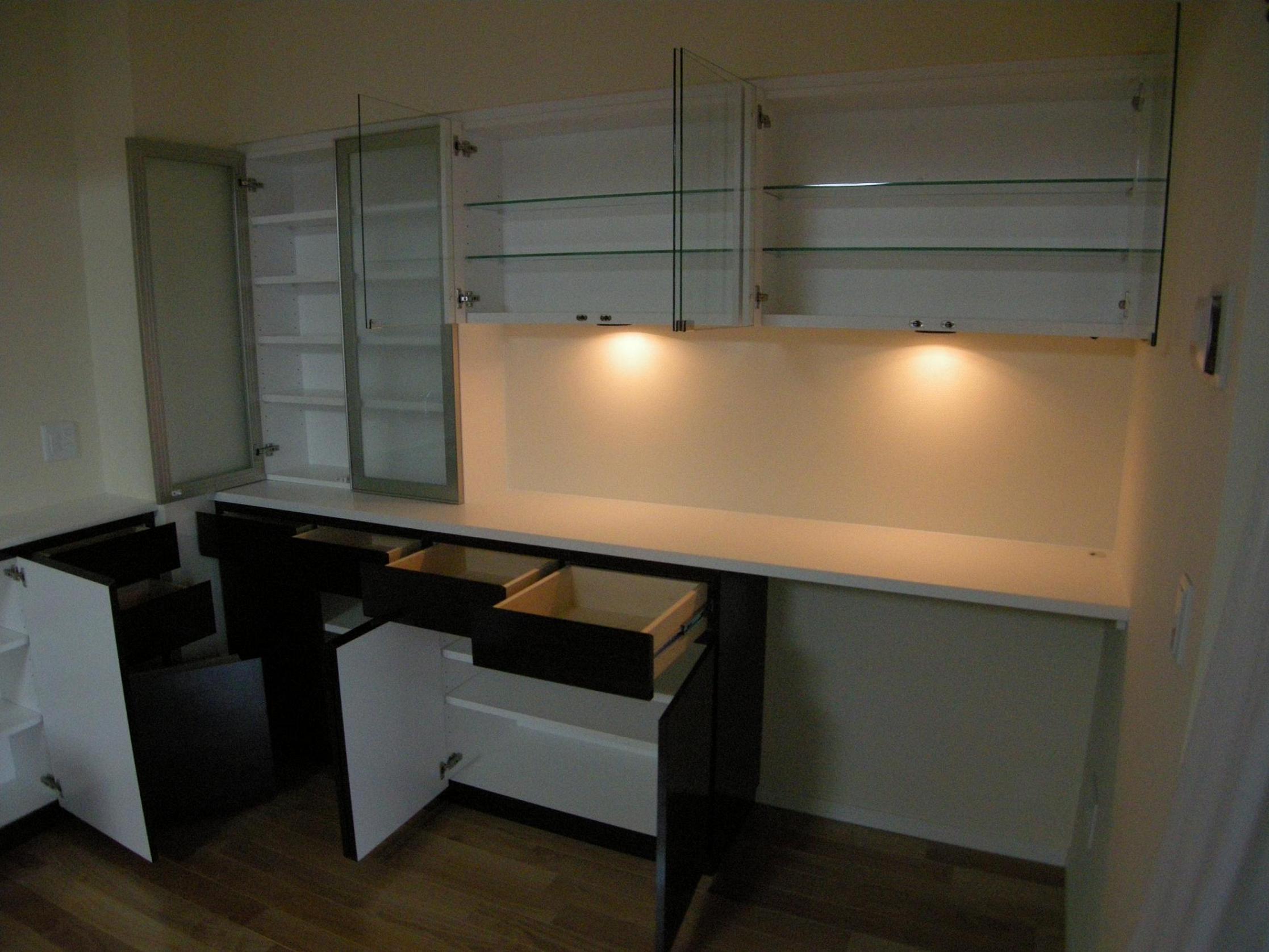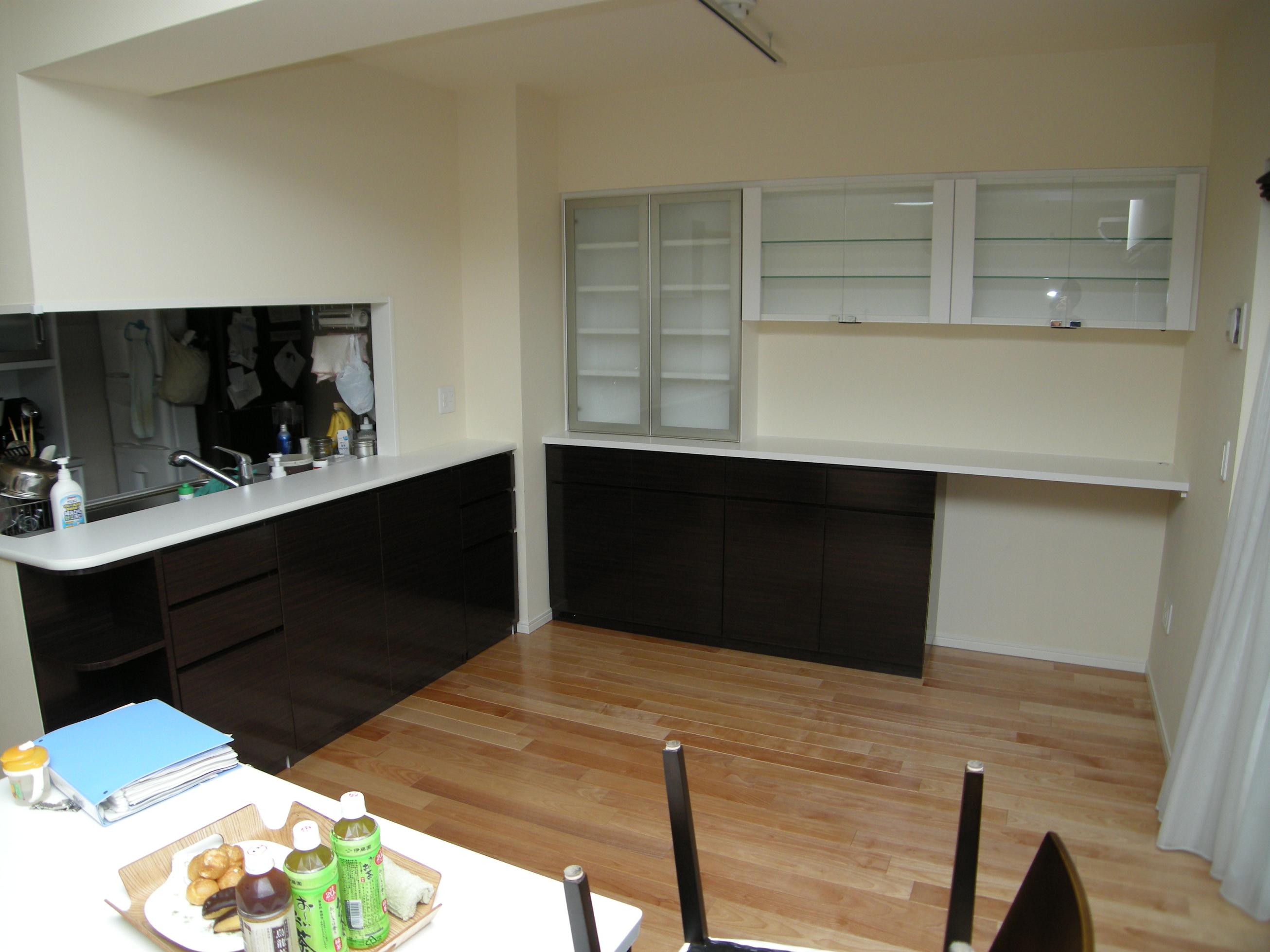 濃色鏡面木目のキャビネットはカウンター下。