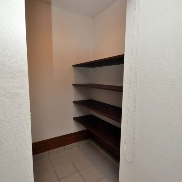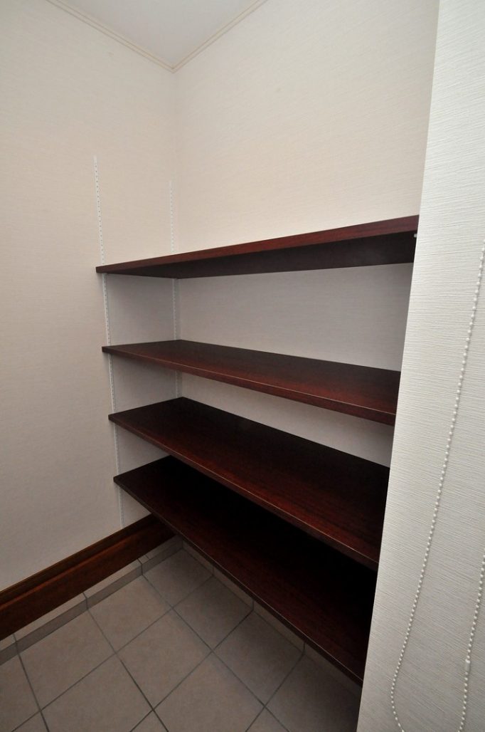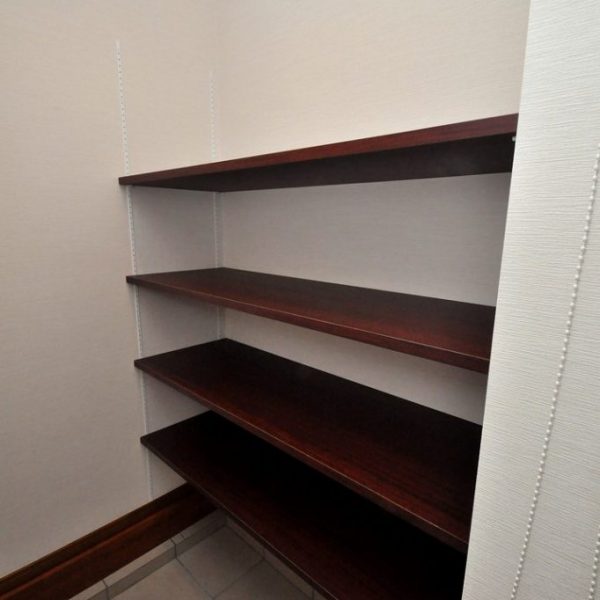 ウォークインのストレージ収納には、アイカ製の木目調ポリエステル化粧合板とメラミン化粧板を併用して製作。
