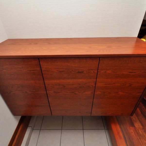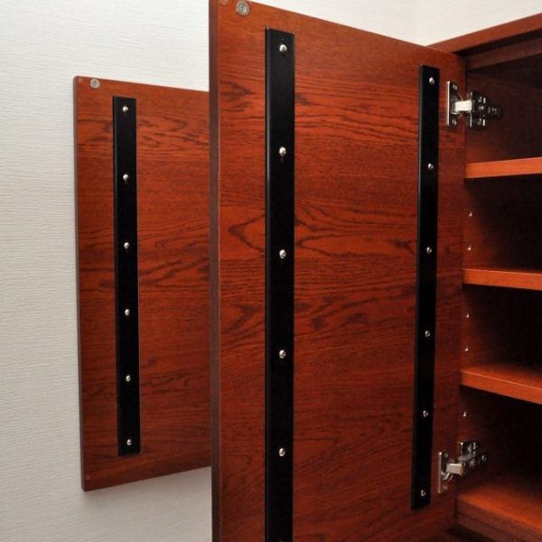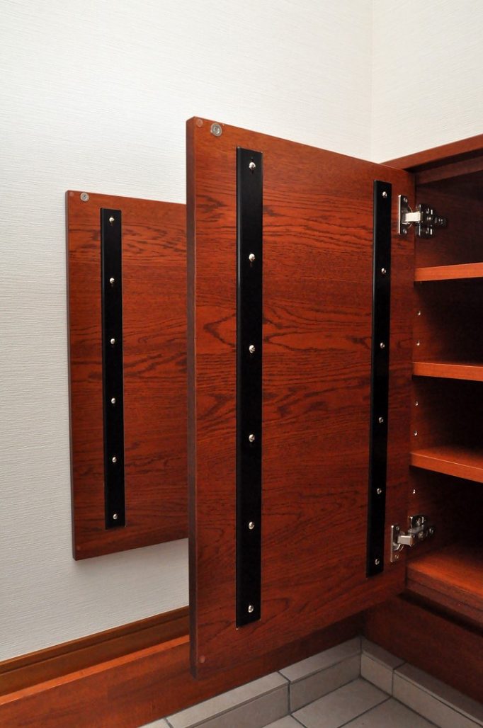 収納内部と収納内の棚板などは近似色のAICA製ポリエステル化粧合板を使わせていただいております。