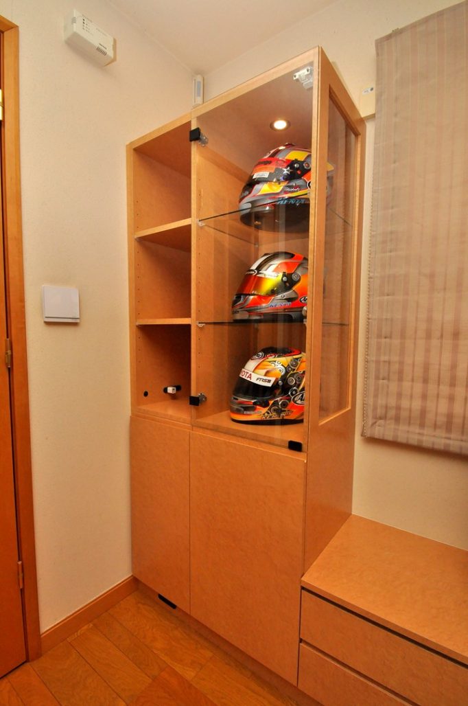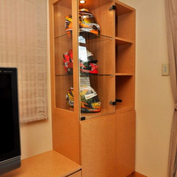 飾り棚部分は展示内容を最大限楽しめるように枠無の強化ガラス扉を採用。