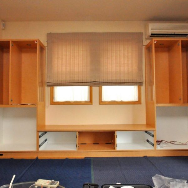 構成は開き戸収納(飾り棚)と抽斗を設けた機器収納となります。